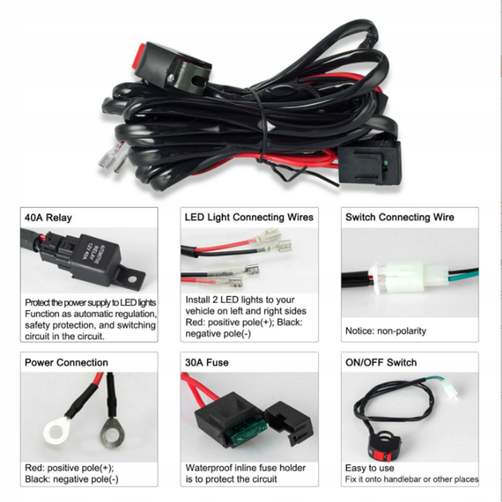 1. Широке застосування: джгут сумісний з усіма мотоциклами 9–32 В, позашляховими мотоциклами, квадроциклами, електромобілями, автомобілями тощо, для модернізації робочого освітлення та прожекторів.