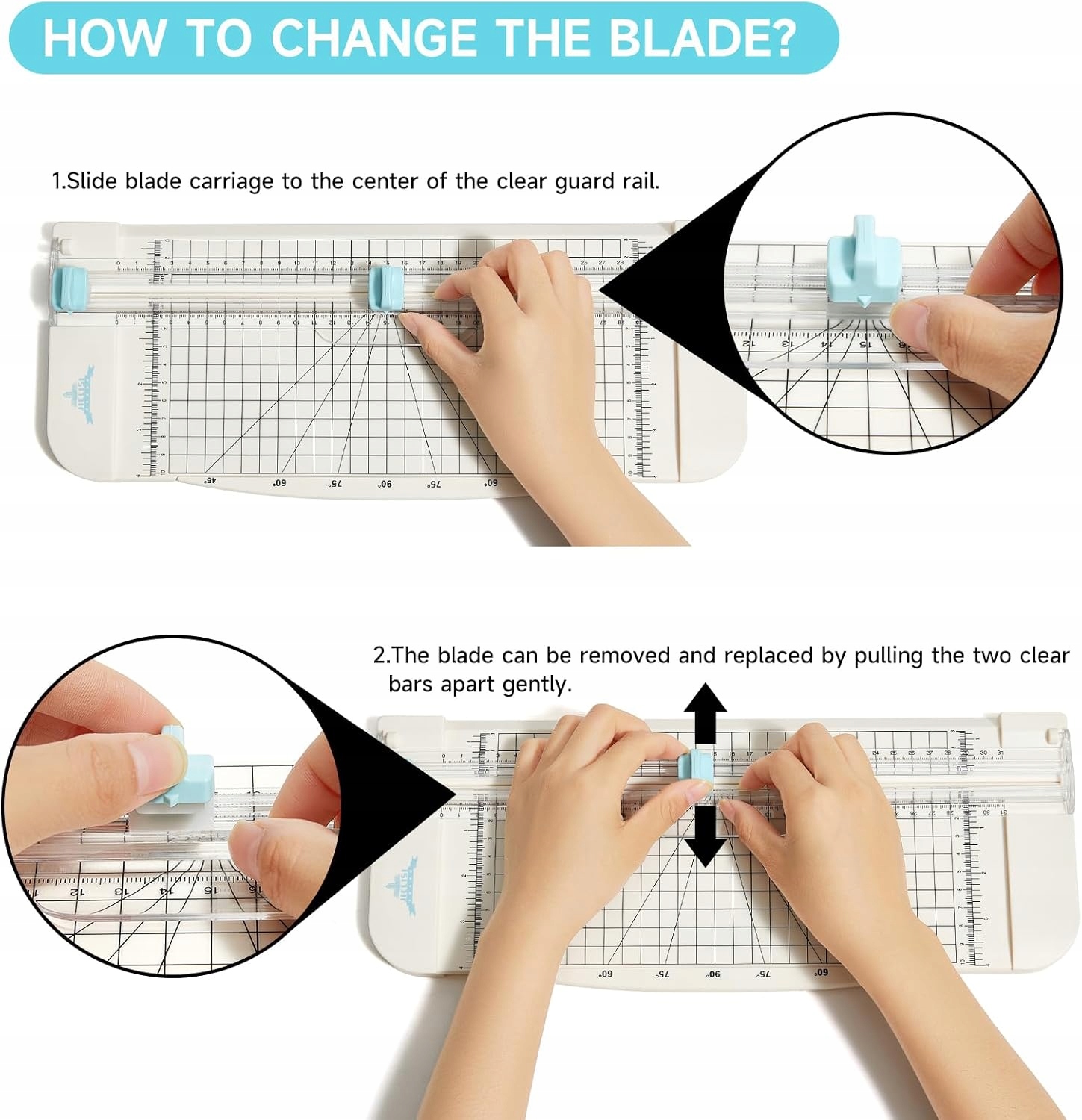 Ми постачаємо 2 гострі леза, які ріжуть в обох напрямках. Лезо можна замінити, коли воно затупиться. 1. Перемістіть каретку леза до центру прозорої напрямної. 2. Лезо можна зняти та замінити, обережно розсунувши дві прозорі смуги.