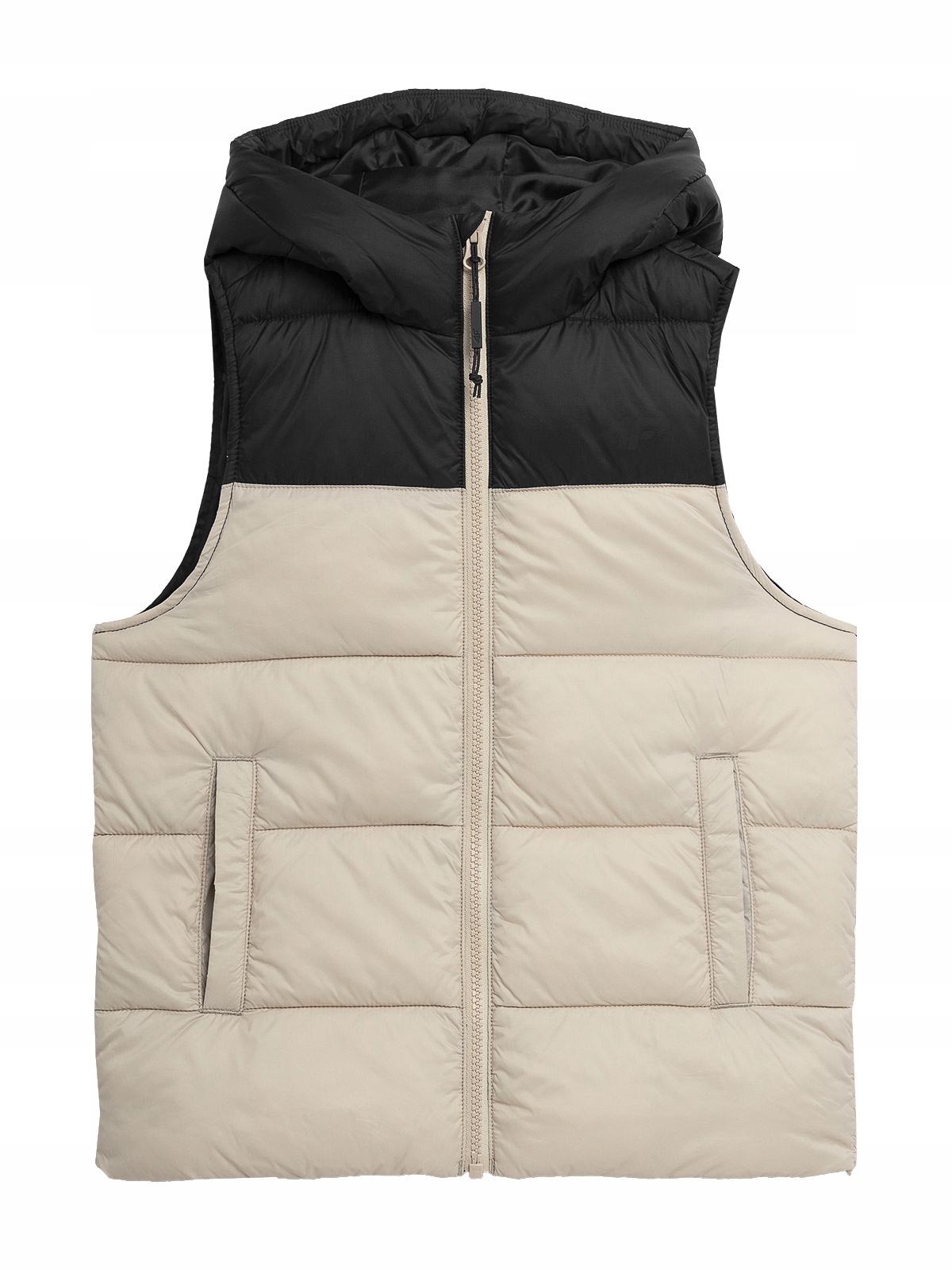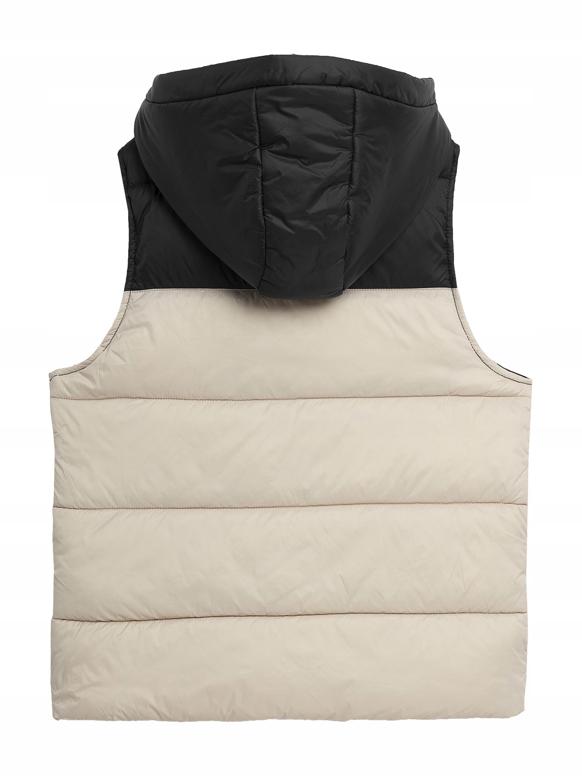 Стьобана жилетка з капюшоном для хлопчика з останньої колекції 4F. Наповнена синтетичним пухом, який разом із технологією 4Warm забезпечує тепловий комфорт у холодні дні. Зовнішній матеріал покритий гідрофобним покриттям, яке захистить куртку від вологи.