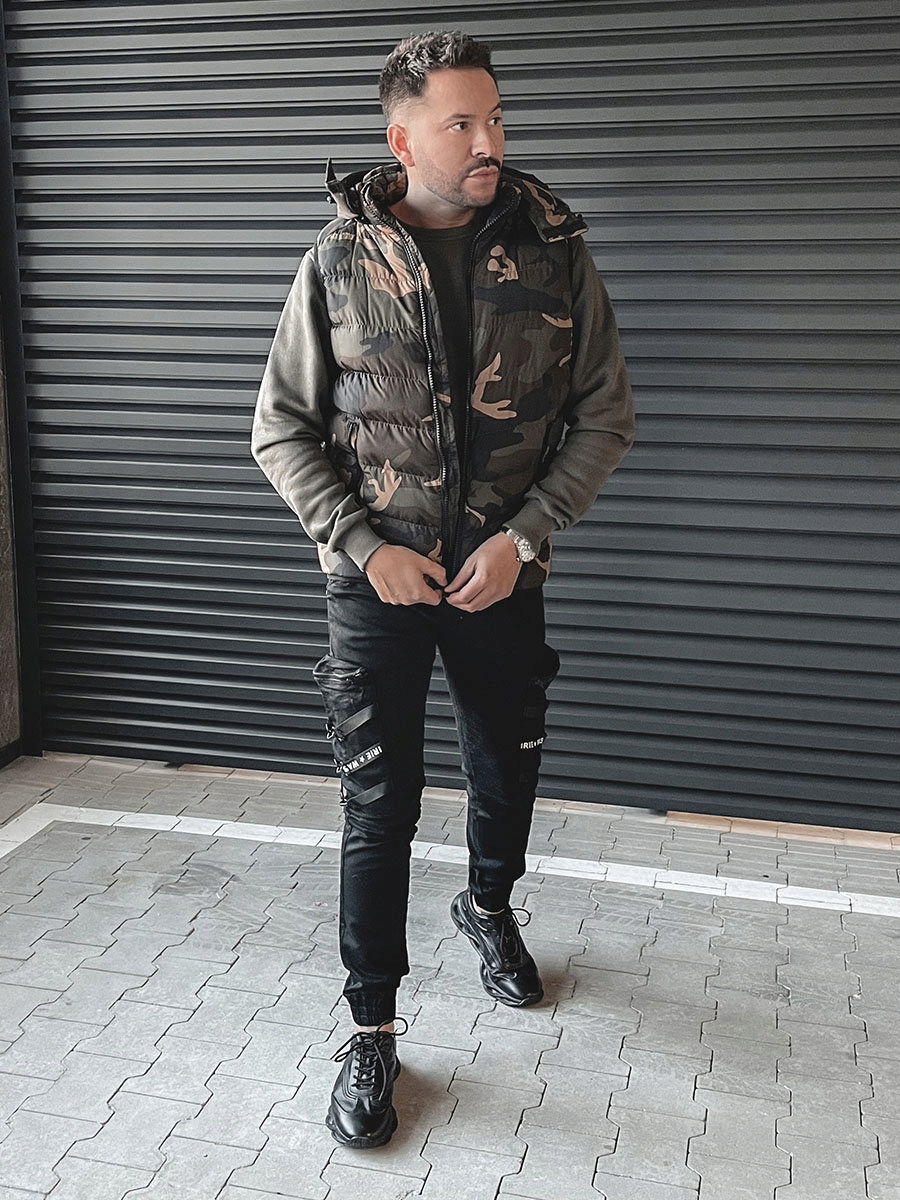 Чоловічий стьобаний камуфляжний жилет з капюшоном кольору хакі Bolf 6876, розмір M