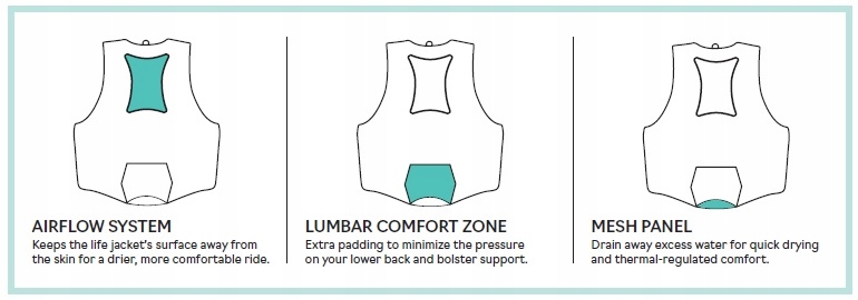 - СИСТЕМА AIRFLOW SYSTEM: внутрішня підкладка EVA, яка утримує поверхню рятувального жилета подалі від шкіри