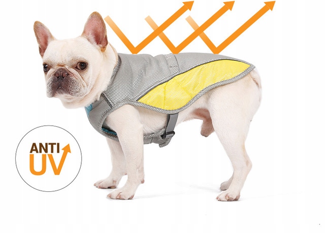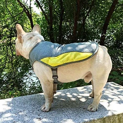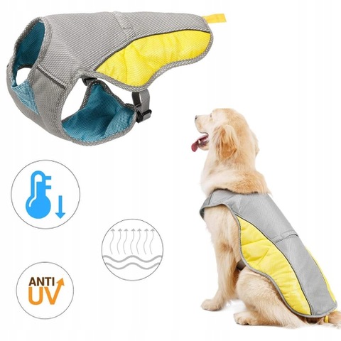Щоб отримати охолоджуючий ефект, просто помістіть жилет у холодну воду, відіжміть його, одягніть собаку, і все! Коли вода випарується, намочіть її знову.