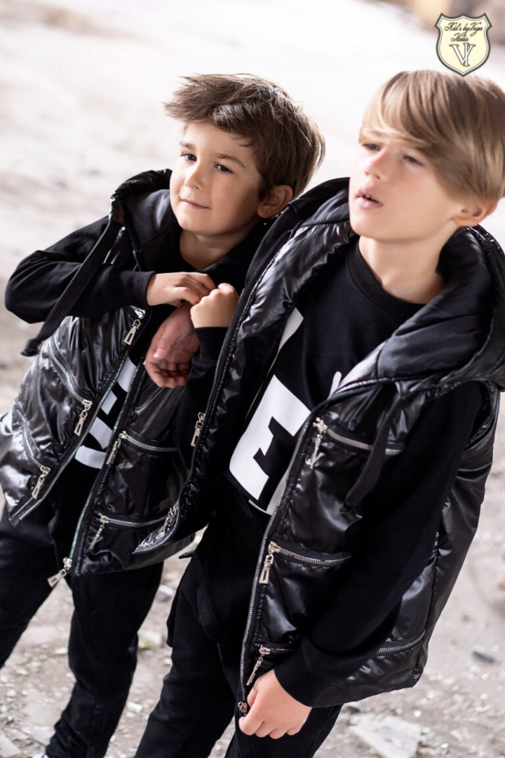 Значно утеплена жилетка монклер пумі на блискавці з великим капюшоном зі шнурком і декоративними сріблястими блискавками. Злегка розширена спинка. Шкіряна нашивка з логотипом бренду підкреслює його неповторний характер.