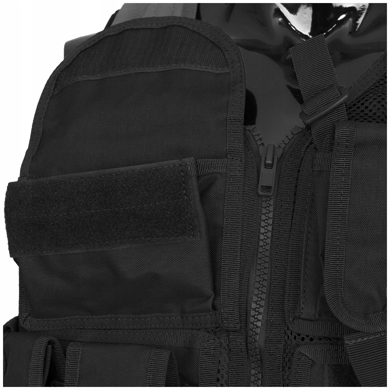 Тактичний жилет розділений на дві частини застібається на блискавку. Права сторона оснащена кишенею з органайзером і панеллю на липучці для нашивок і 3 стандартних сумок STANAG. Ремені над плечем оснащені протиковзкою накладкою на приклад. З лівого боку розташовані 4 універсальні підсумки для магазинів для пістолетів, кобура для кожної моделі пістолета з підсумком для магазинів для пістолетів і один підсумок стандарту STANAG . Кобура знімна. Усі сумки застібаються на липучки.