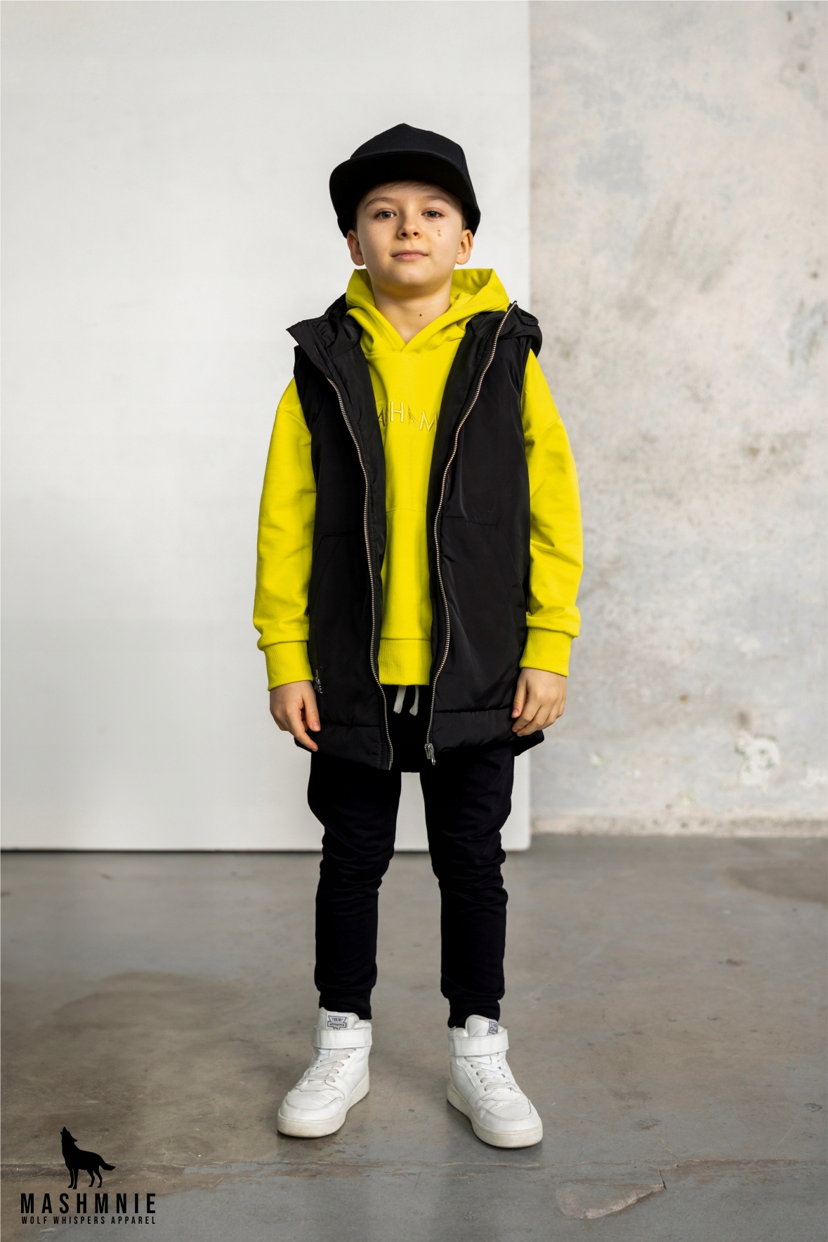 Чорна жилетка з капюшоном була розроблена для дівчаток і хлопчиків.