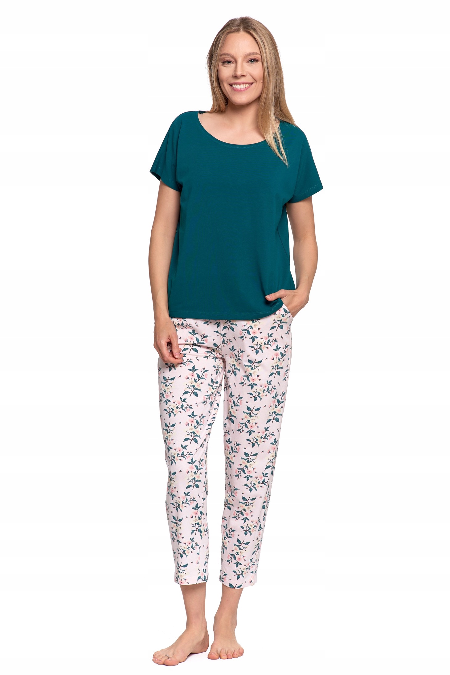 Комфорт, який поєднується зі стилем. Ця жіноча піжама створена для щоденного комфорту - як вночі, так і під час лінивих ранків. Гладка темно-зелена футболка чудово поєднується з брюками з ніжним квітковим малюнком. Вільний крій і м'яка тканина роблять цей комплект улюбленим вибором багатьох жінок.