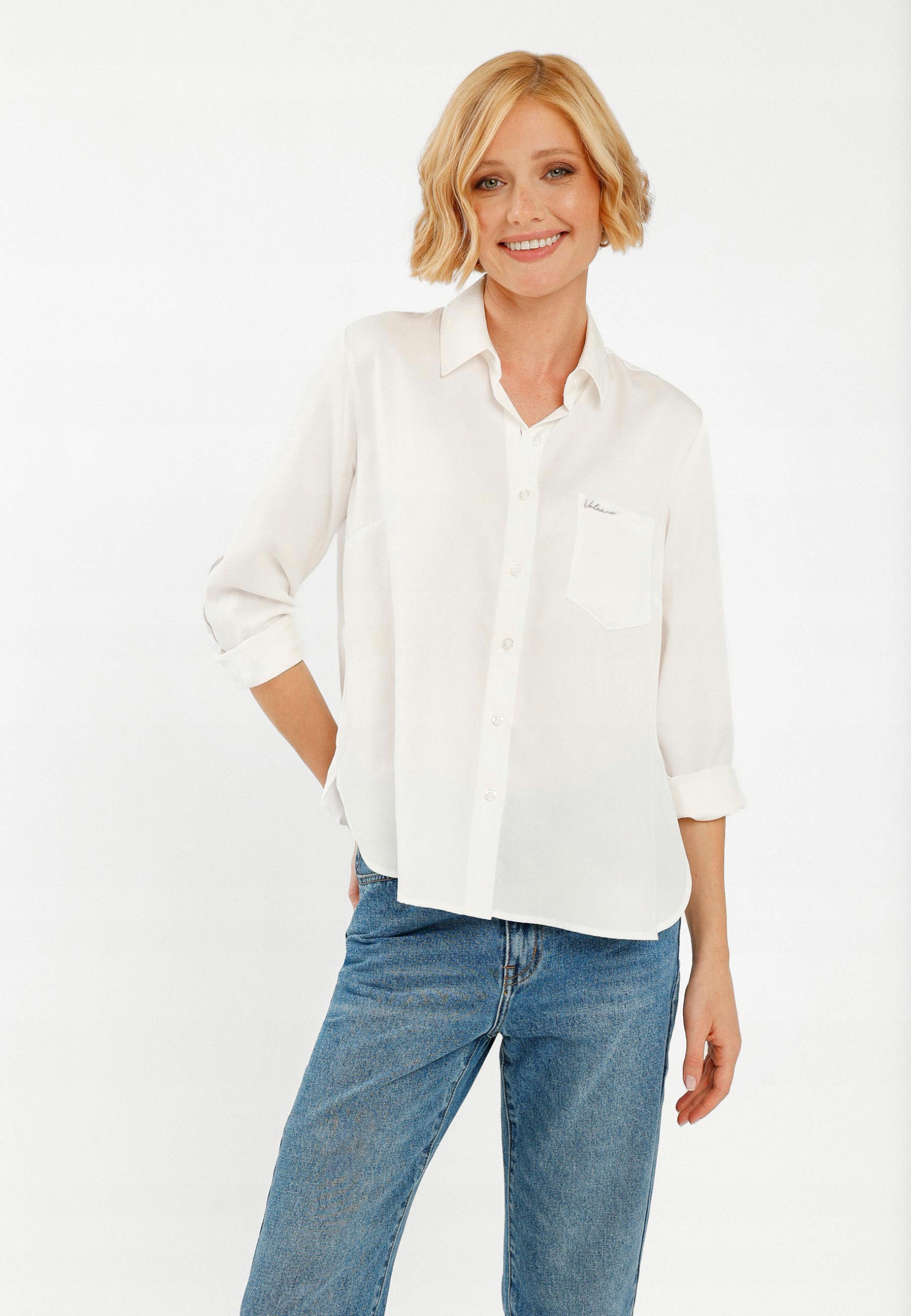 Ця жіноча біла сорочка поєднує класичний стиль і повсякденну елегантність. Виготовлений з натурального, приємного на дотик матеріалу, забезпечує комфорт протягом усього дня. Класичний, але трохи більш повсякденний крій у поєднанні з вільним заокругленим низом гарантує необмежувальну посадку.