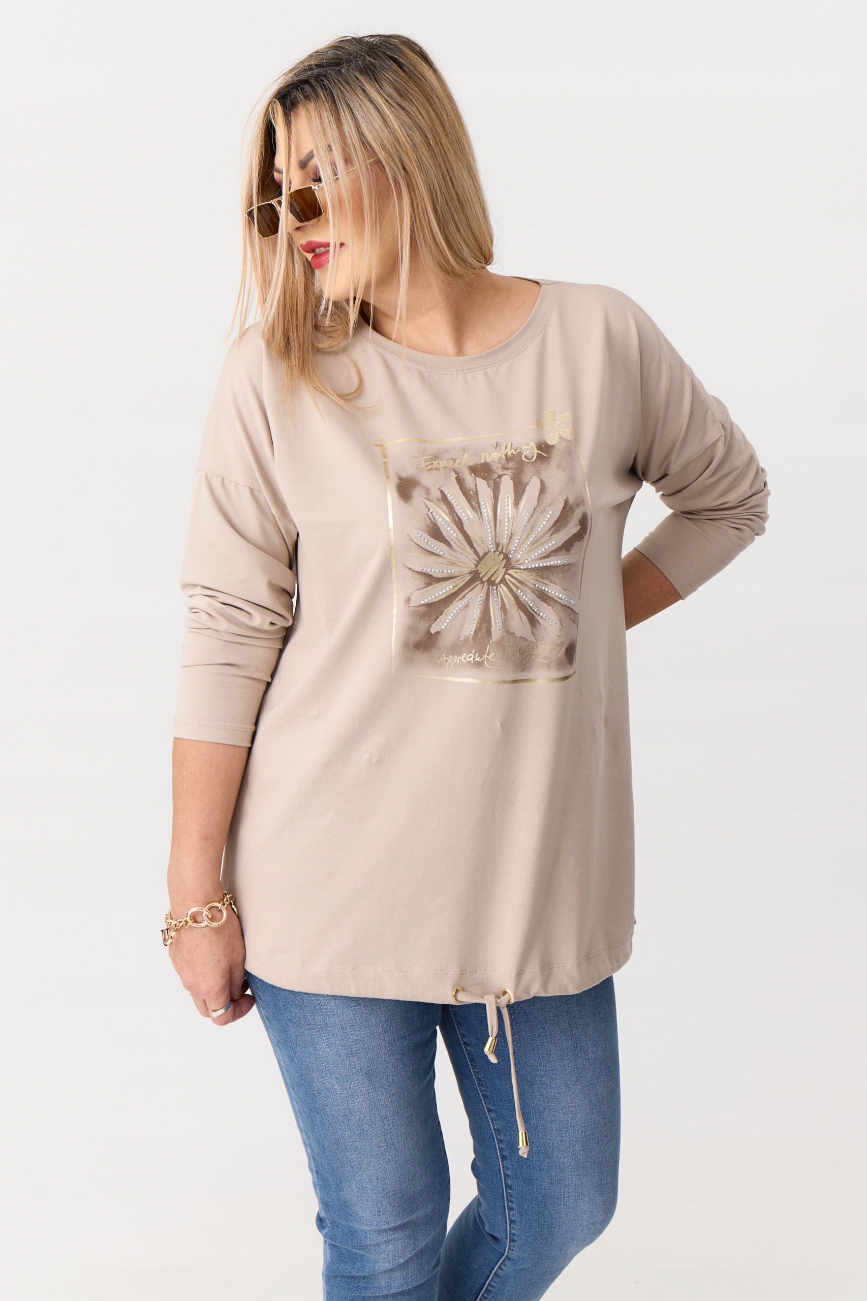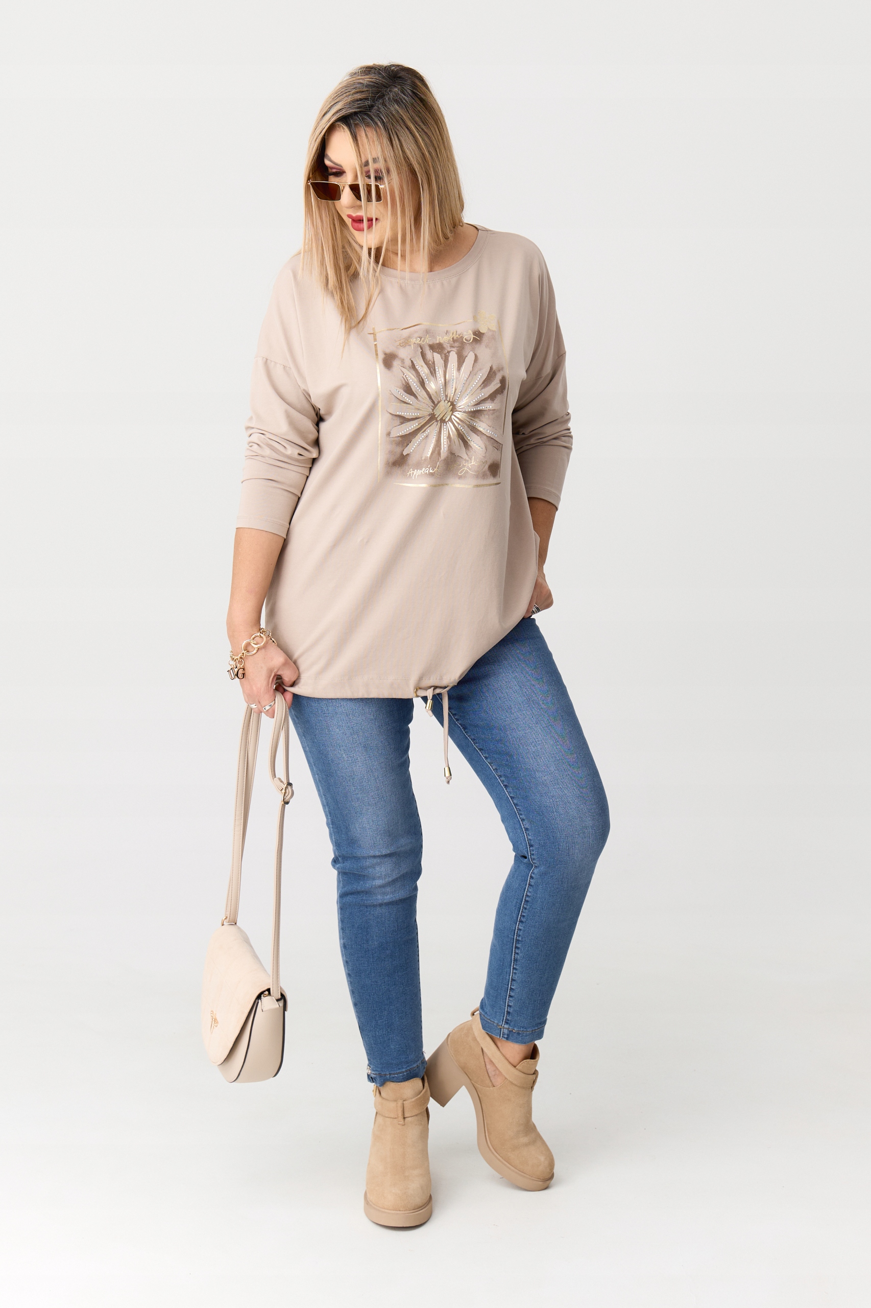 ✅ декоративний принт із квітковим мотивом на передній частині, додатково прикрашеним блискучими елементами