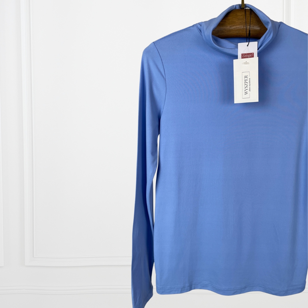 - Гольф з гладкої марки, в красивому синьому кольорі. Він був зроблений з приємного до сенсорного матеріалу. У ньому класичний, простий виріз і довгі рукави. Гольф переповнений. Гольф у цьому кольорі є обов'язковим для кожного гардеробу.