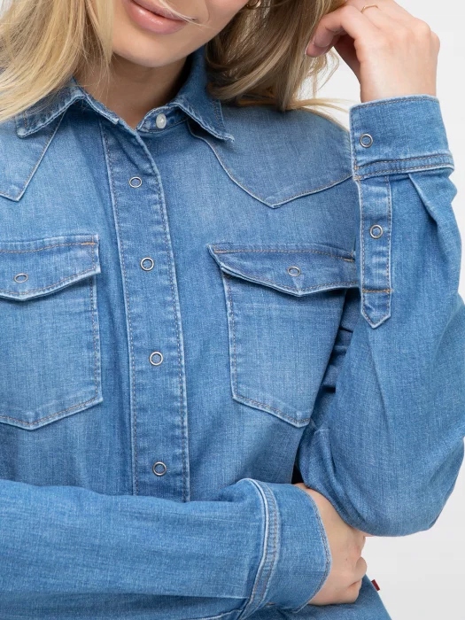 ЖІНОЧА ДЖИНСОВА СОРОЧКА NORRA 239 - найкращий вибір для повного джинсового стилю, але не тільки. Жіноча джинсова сорочка має приталений крій і класичний комір. Стильними деталями в даному випадку, безперечно, є дві кишені спереду та застібка на декоративні кнопки. Джинсова сорочка ідеально сидить по фігуріі підкреслює всі її достоїнства. Він виготовлений з високоякісної бавовни, що безпосередньо впливає на його довговічність. Зріст моделі: 175 см Розмір сорочки: S