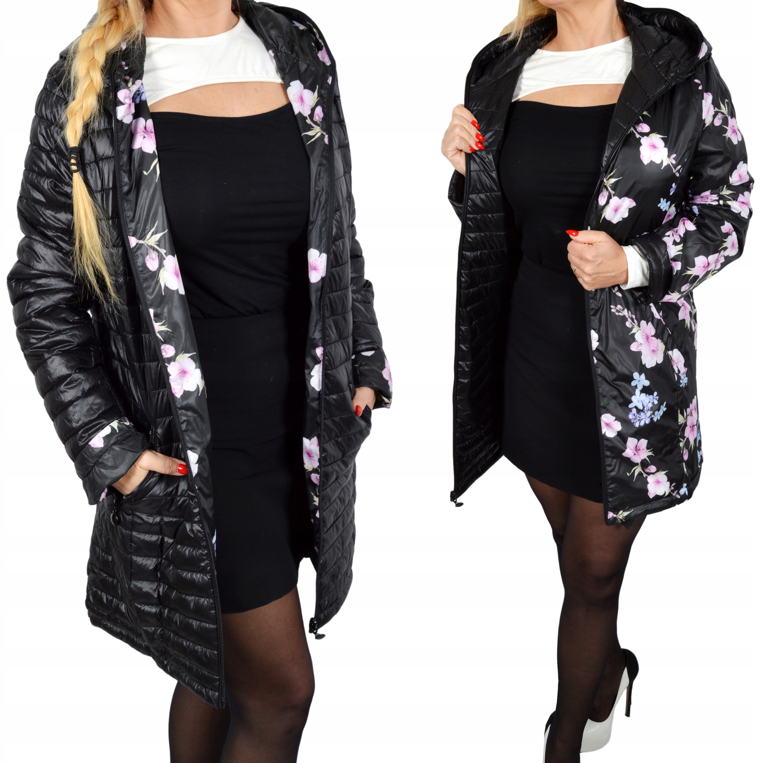 - Дві кишені з боків, застібаються на блискавку. Піджак двосторонній, з іншого боку красиві пастельні квіти