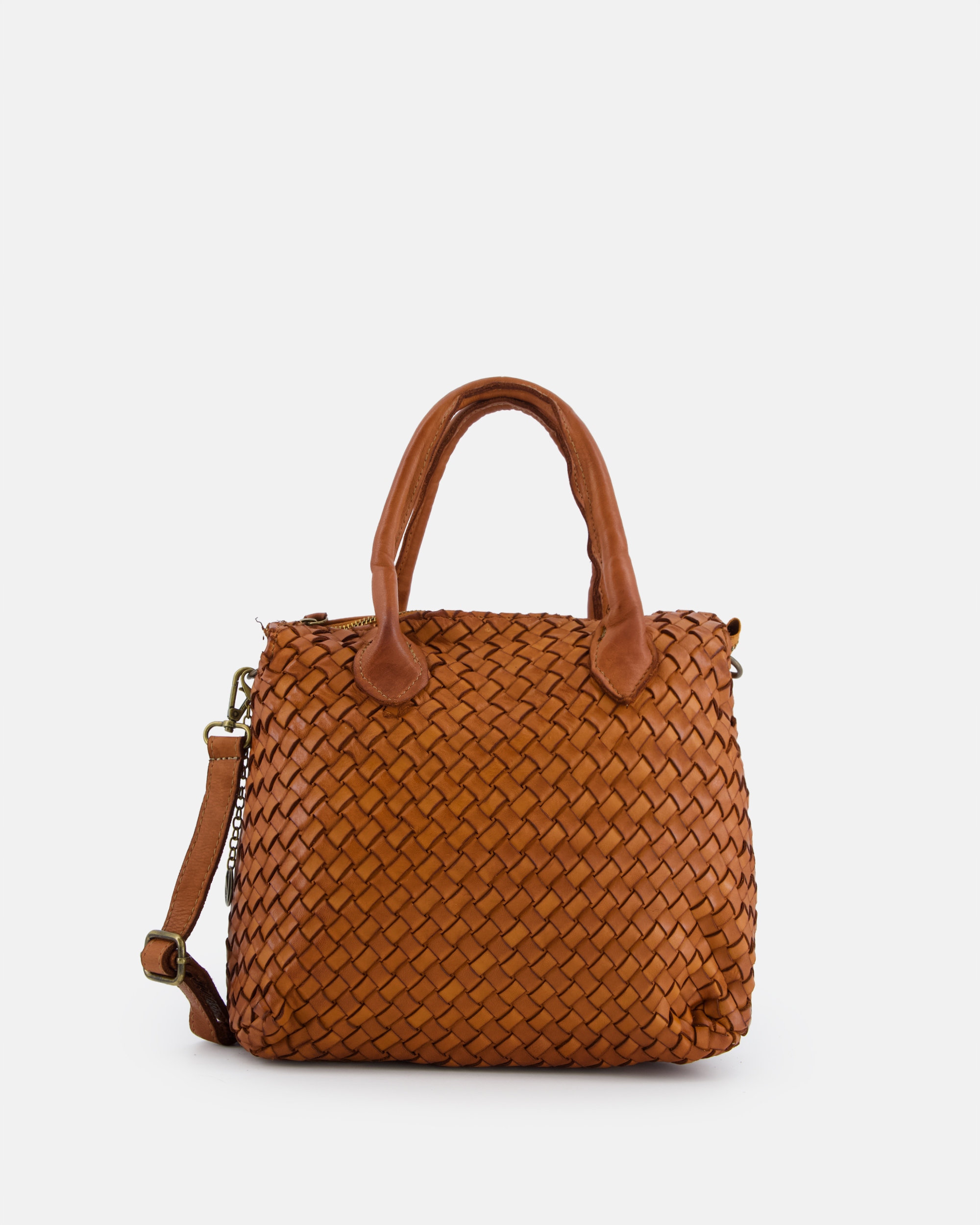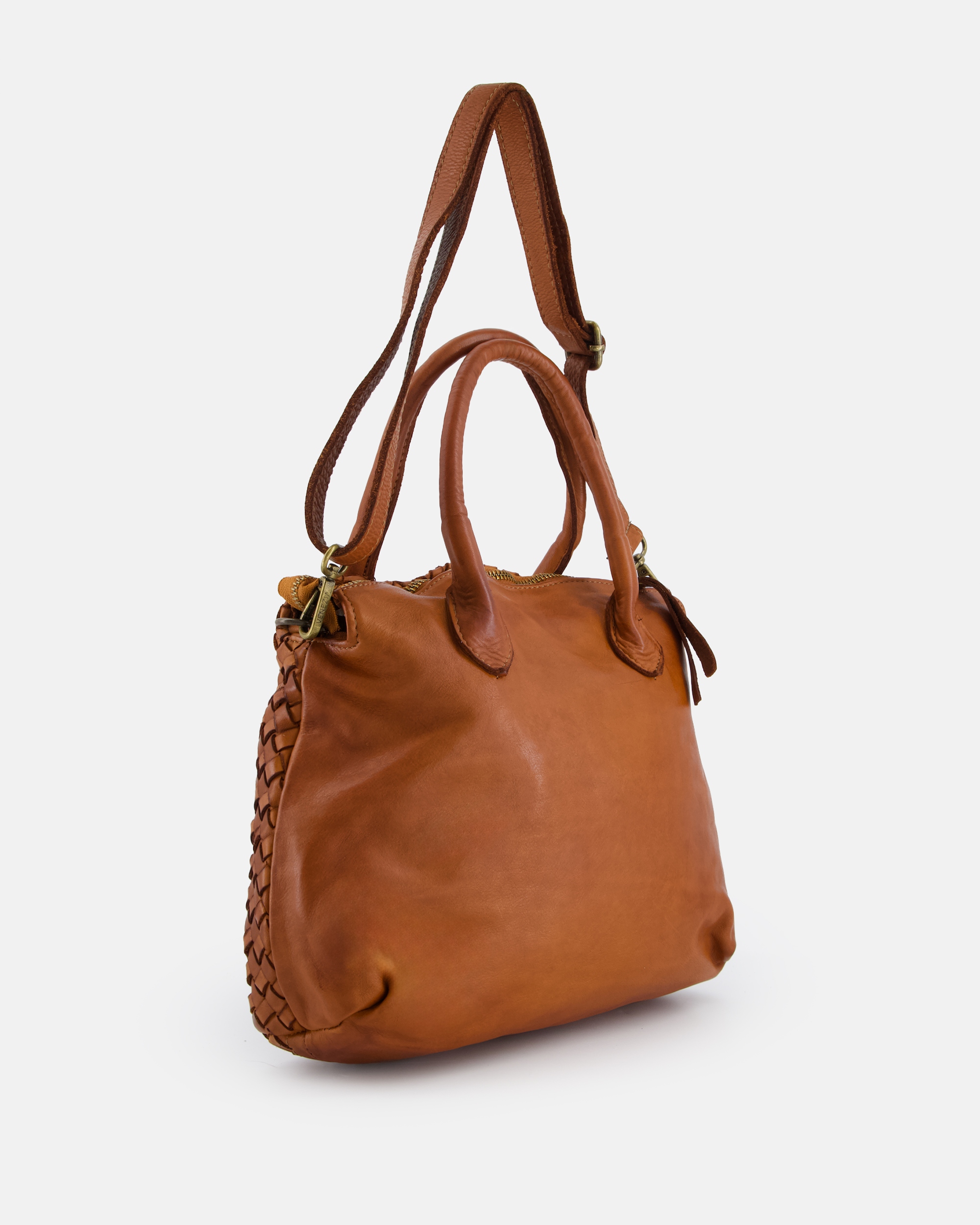 Шкіряна сумка через плече світлого коричневого відтінку — це поєднання легкості та стилю в міському випуску. М’яка, нежорстка конструкція ідеально підходить під час носіння, а плетена передня частина надає їй унікальний характер. Спинка залишається гладкою, що створює цікавий контраст текстур. Дві зручні ручки дозволяють носити її в руці, а знімний ремінь дозволяє повісити сумку через плече. Все це доповнюється стильною фурнітурою кольору старовинного золота - тонкою деталлю, яка додає сумці елегантності та класу.