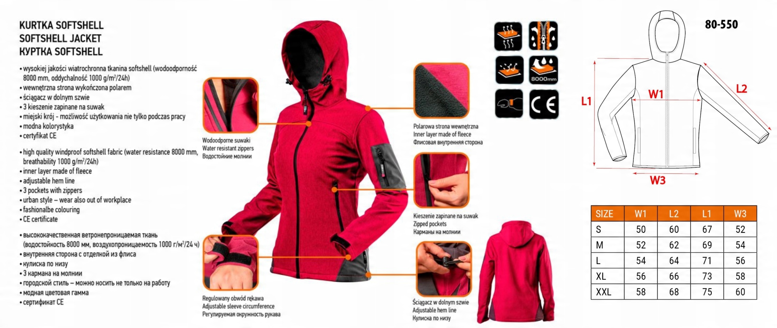 водонепроникний, вітронепроникний і дихаючий продукт. Куртка легка і зручна, і в той же час тепла, завдяки флісовій внутрішній частині. Виріб має 3 кишені на блискавках із захистом від бризок. Модні кольори та міський крій дозволяють використовувати виріб і поза роботою. Куртка пошита по жіночій фігурі. Якість гарантується європейським сертифікатом та виконанням згідно стандарту EN ISO 13688:2013. Торгова марка NEO відповідає очікуванням професіоналів.
