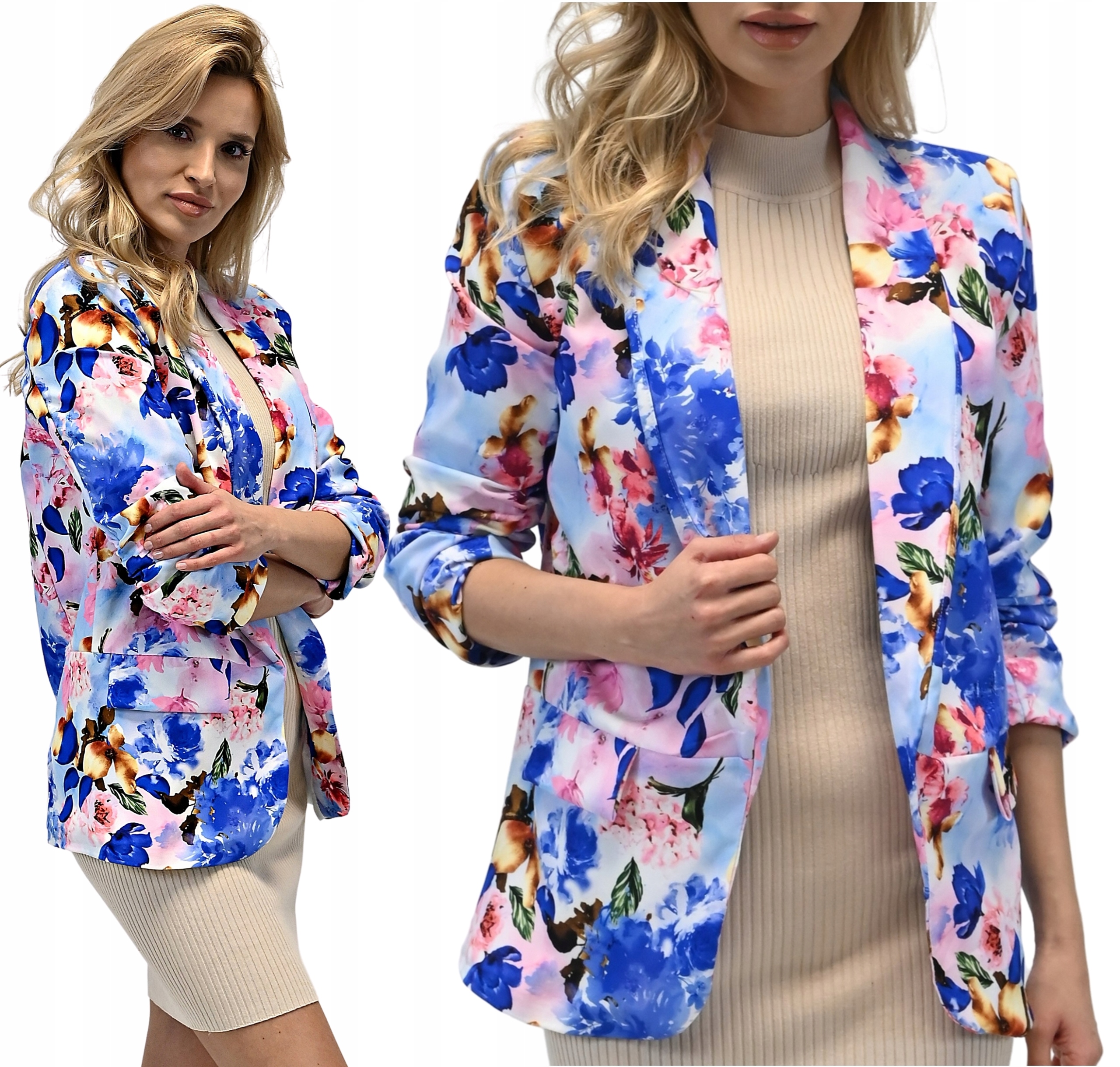 Унікальна модна вільна куртка з оригінальним барвистим квітковим принтом насичених кольорів. Довша модель, комір-смокінг 3/4 драпірованих рукавів додають оригінальний характер. Дві імітації кишень з боків з ефектними клапанами прикрашають куртку. Дизайн для схуднення з підкладкою та м’якими підплічниками. Чудова якість, ідеальна обробка!