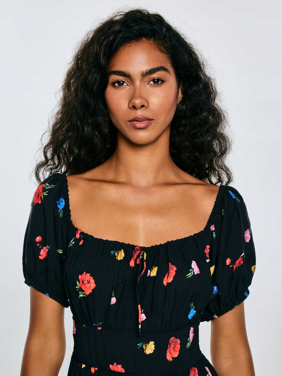 Довга сукня з віскози з квітковим принтом на чорному фоні - легка, жіночна та ідеальна для теплих днів. Розкльошений низ з розрізом спереду надає силуету легкості та тонкої чуттєвості. Сукня має короткі рукави-дуфи та регульований квадратний виріз, який красиво підкреслює лінію плечей. Мереживні вставки додають романтичний характер, а еластична спинка забезпечує зручну посадку. Все це доповнюється металевою пластиною з логотипом, яка є елегантною деталлю.