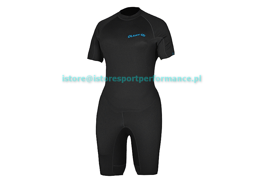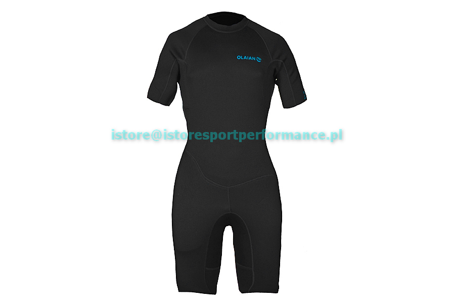 Короткий гідрокостюм Olaian призначений для жінок, які займаються водними видами спорту, такими як серфінг, віндсерфінг, кайтсерфінг, вейкбординг, водні лижі тощо у воді з температурою 20°-25°C. Гідрокостюм виготовлений з неопрену, неопрен – це еластомерна піна з закритими порами (поліхлоропрен), що містить бульбашки азоту, які мають ізоляційні властивості. Теплоізоляція забезпечується неопреном товщиною 1,5 мм, який підкладений поліестером для підвищення стійкості до стирання та забезпечення повної свободи рухів. Зріз поролону дозволяє вільно гребти руками. Неопрен забезпечує кращу стійкість до морських умов і ультрафіолетового випромінювання. Плоскі, гнучкі шви забезпечують герметичність і підвищують комфорт носіння гідрокостюма. Поролон застібається ззаду на блискавку та додатково має застібку-липучку, яка запобігає відкриванню блискавки.