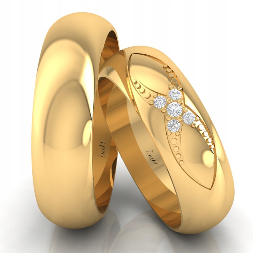 Елегантні, напівкруглі весільні кільця, виготовлені з жовтої золотої спроби 333. Вічний і мінімалістичний чоловічий кільце супроводжується стильно прикрашеним жіночим обручкою. Всередині делікатного діамантового малюнка загорнути п’ять світиться каміння - дорогоцінні алмази або привабливі стрази на вибір. Вся композиція виражає тонку жіночу красу та підкреслює красу жіночих рук. Ми вкладаємо все своє серце в дизайн цих кілець, щоб вони найкраще захоплювали красу вашої любові.