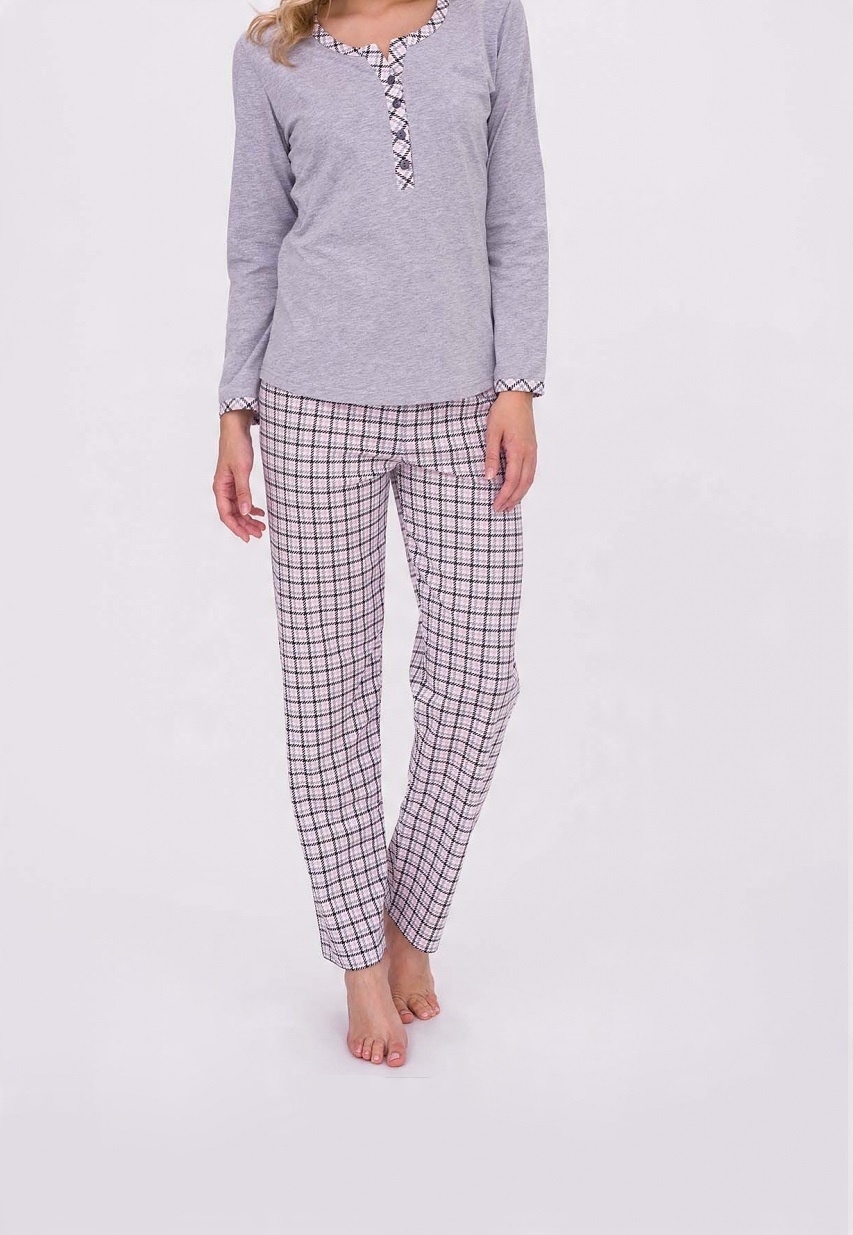 Зручна та комфортна жіноча піжама з високоякісної бавовни. Меланжева футболка з довгим рукавом. Горловина і манжети оброблені кольором в тон штанів. Довгі брюки з малюнком. Склад: