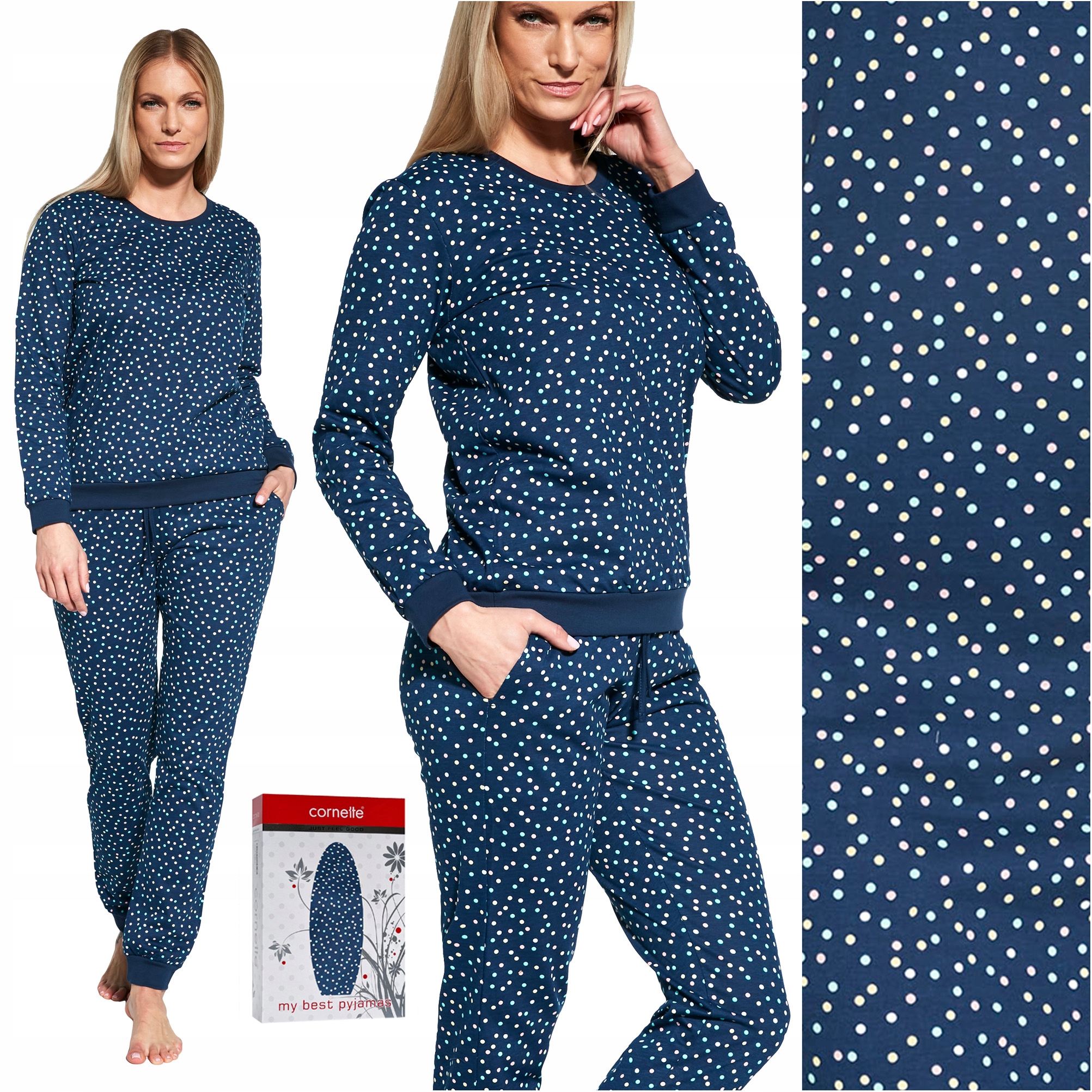 - Темно-синій комплект, прикрашений візерунком у різнокольоровий горошок.