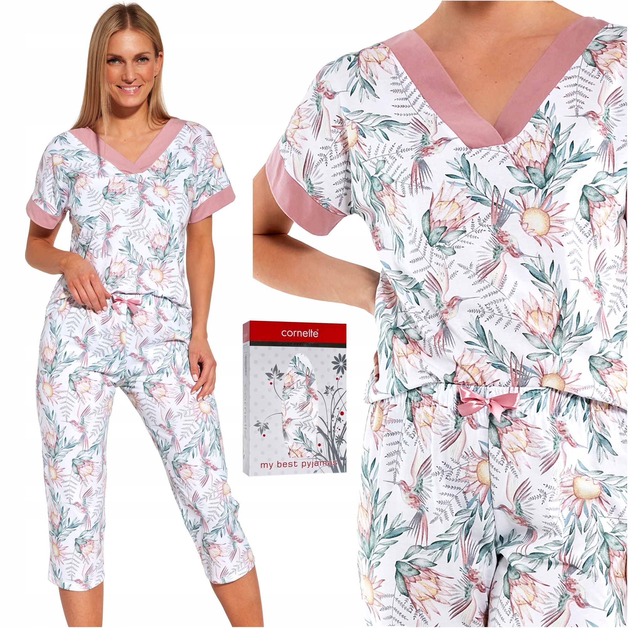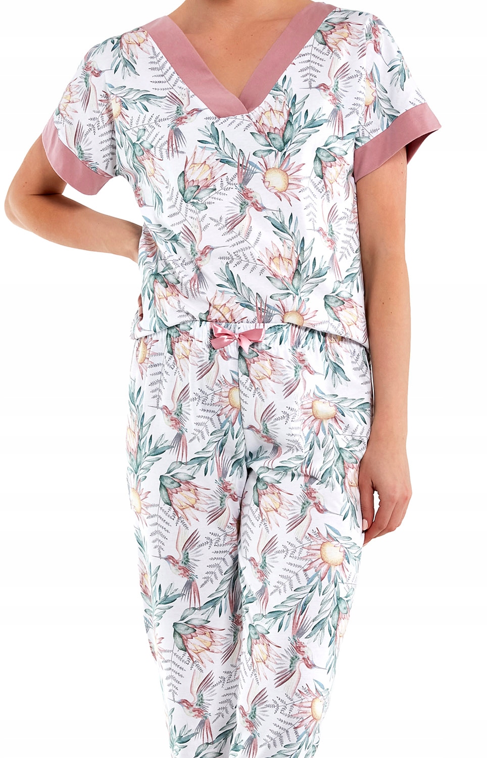 - Блузка та штани з красивим квітковим орнаментом і мотивом колібрі.