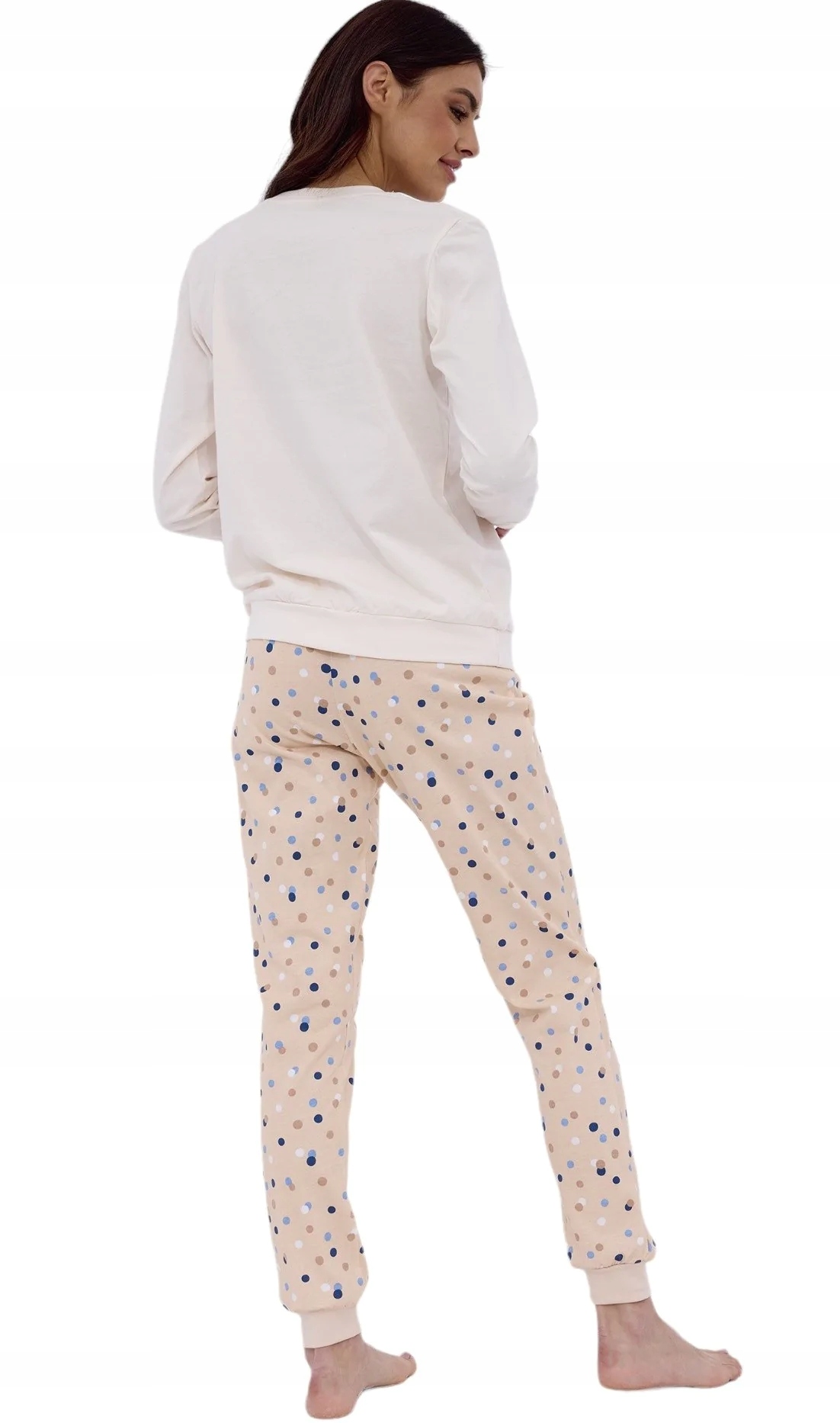 Комплект доповнено довгими брюками персикового кольору в різнокольоровий горошок