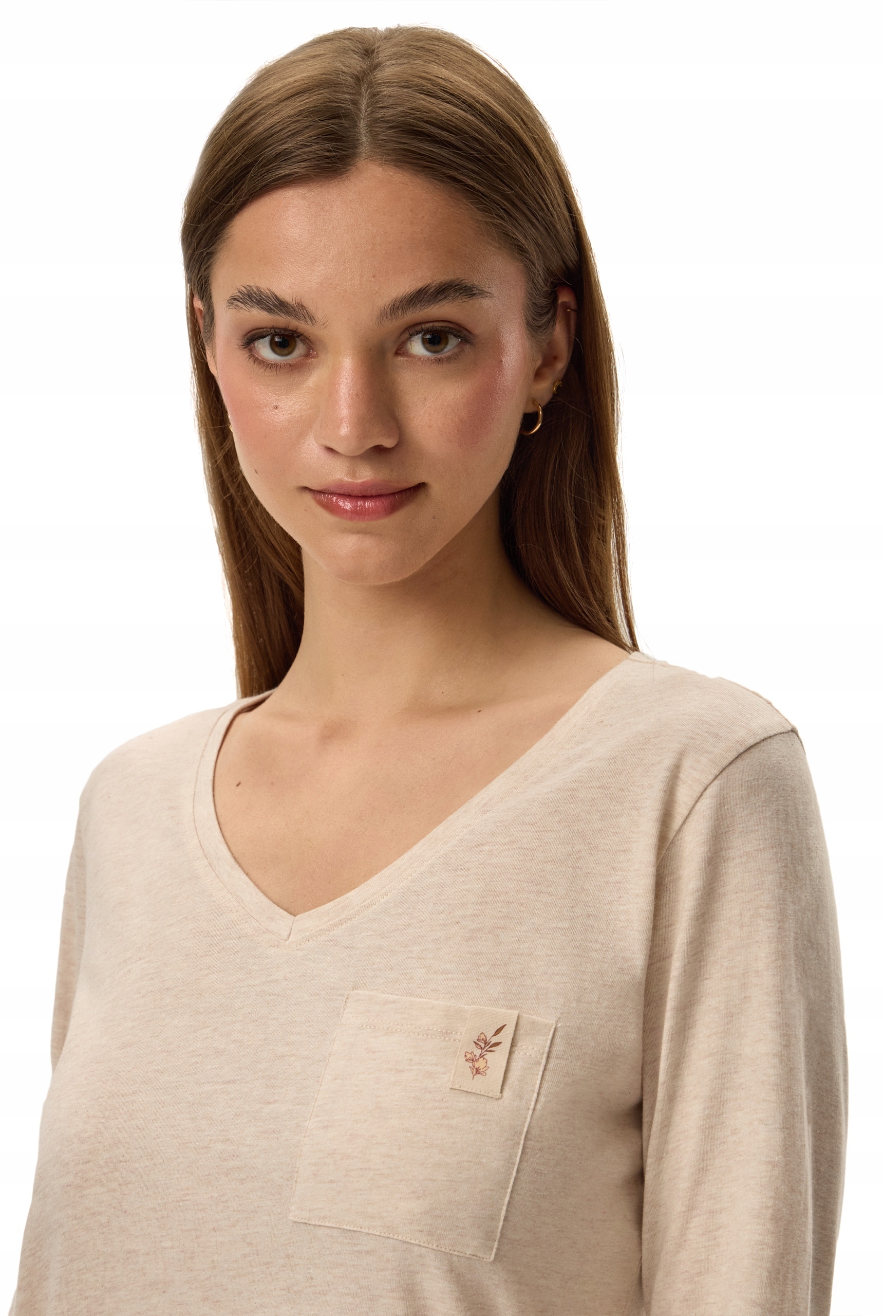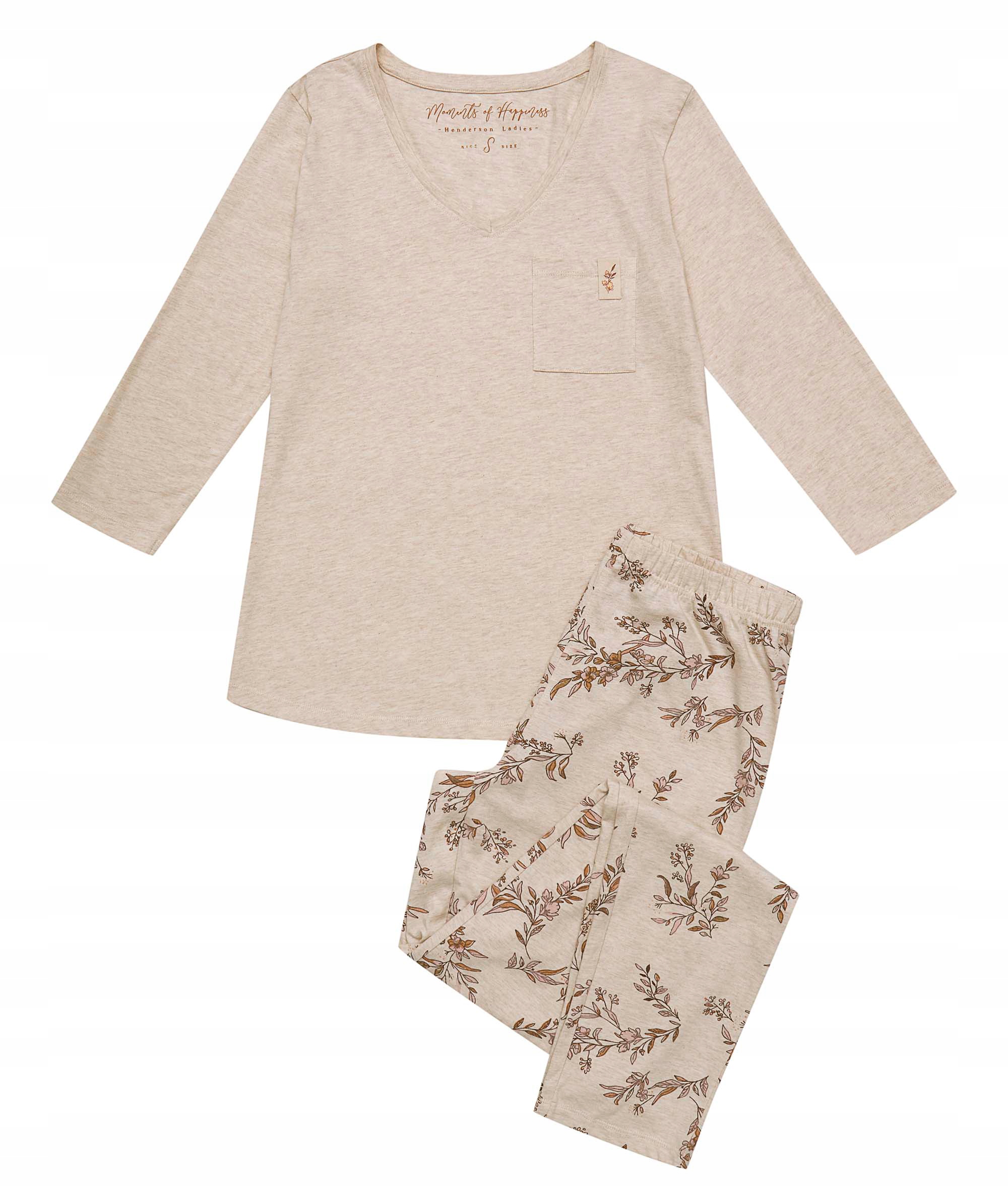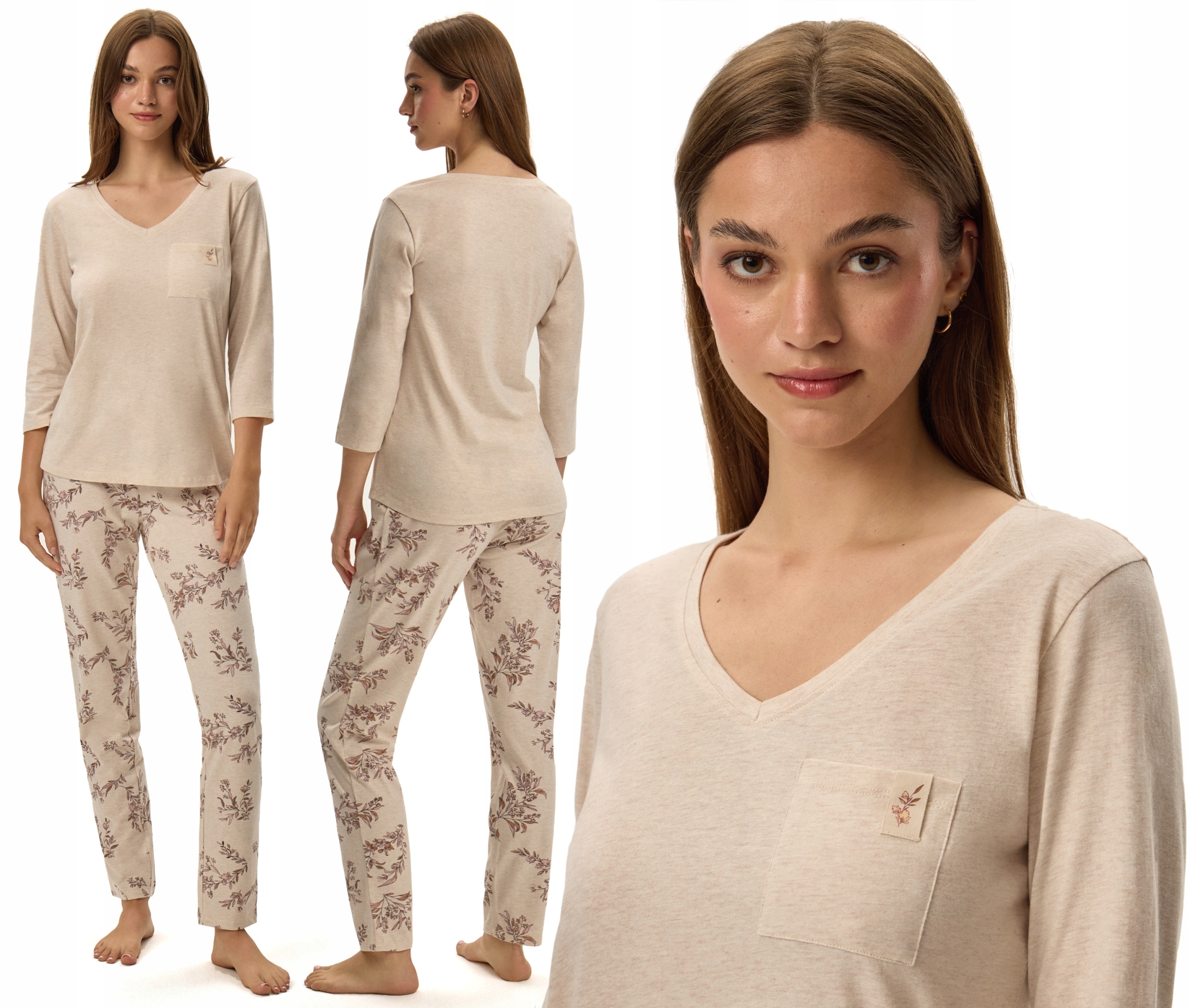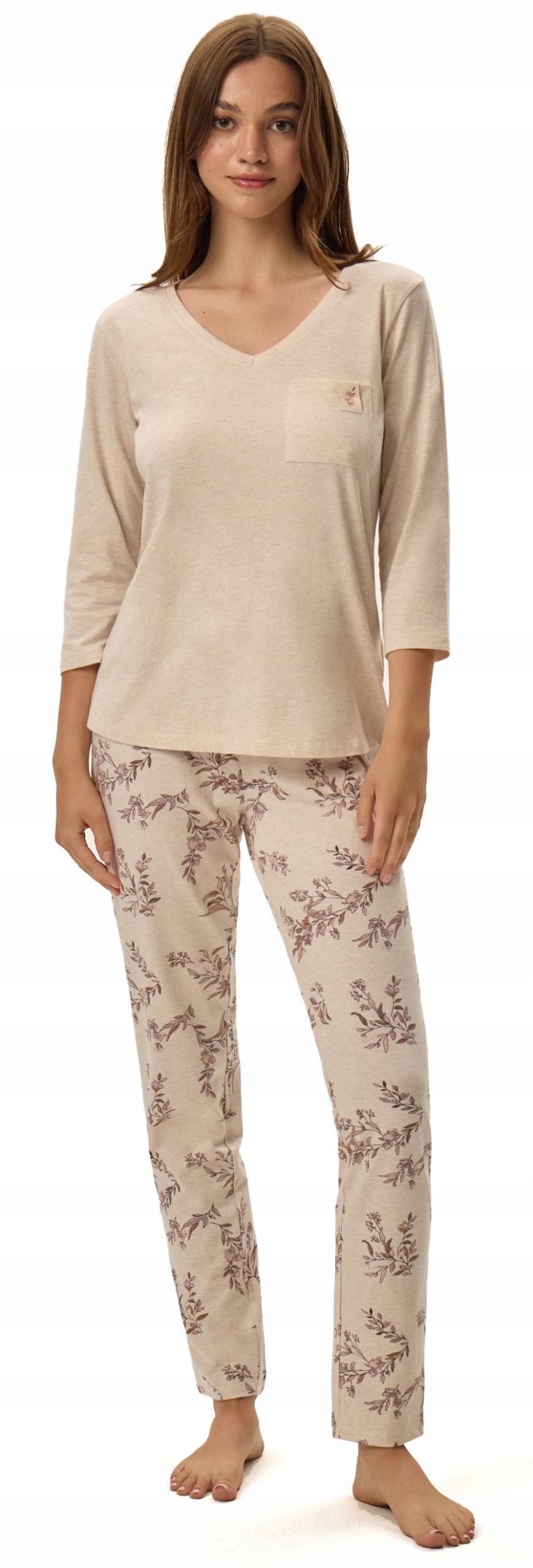 ⭐ Верх піжами складається з бежевої блузки з характерною кишенею та нашивкою. Довжина рукавів 3/4.