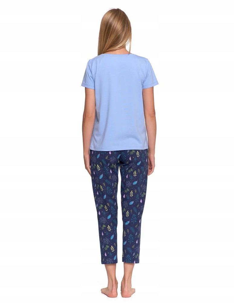 Все складається з гладкої футболки красивого блакитного кольору та довгих штанів, прикрашених ботанічними мотивами листя та маленьких квітів. Це позачасовий набір, розроблений для жінок, які цінують комфорт і модний вигляд навіть під час відпочинку вдома. Він добре підійде як як піжама, так і як стильний домашній одяг для ледачих ранків.