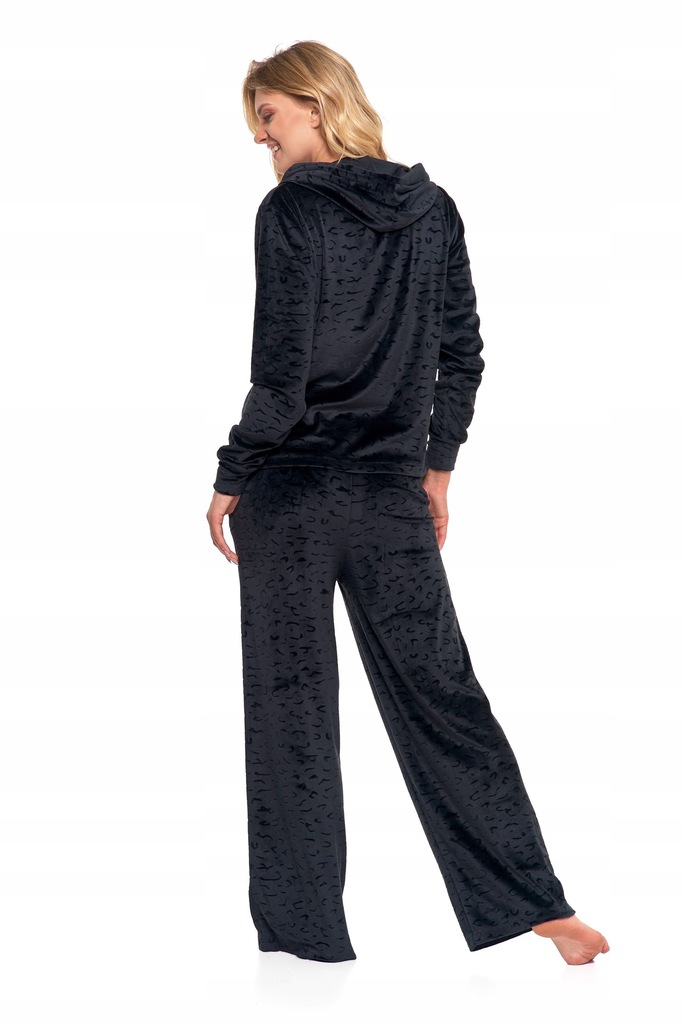 Широкі штани ідеально адаптуються до фігури, гарантуючи максимальний комфорт та свободу. Гнучка талія забезпечує комфортне носіння цілий день. Чорний колір та елегантний малюнок роблять цю піжаму ідеальною не лише для сну, але і як стильний набір для проведення ледачих днів вдома.