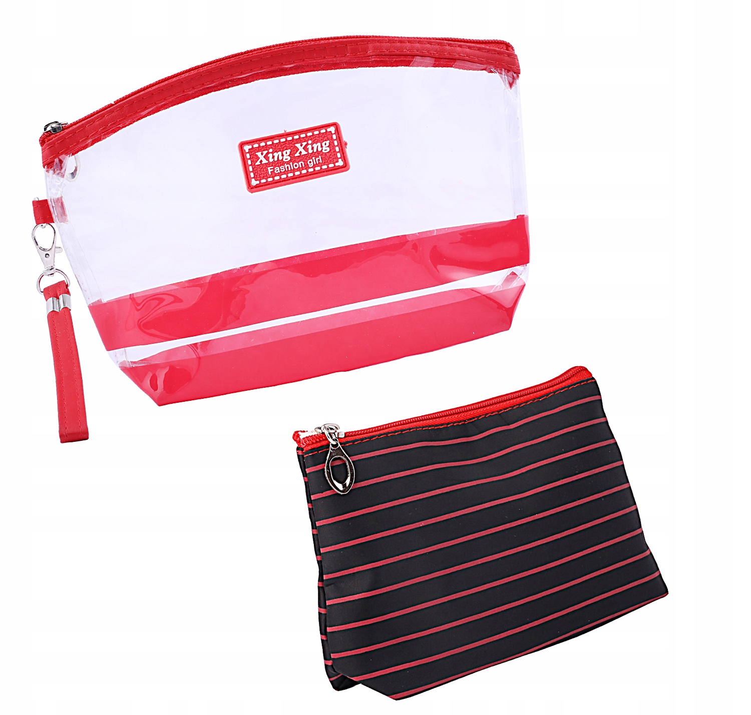 Набір з двох однокамерних косметичок: більшої прозорої та меншої в смужку.