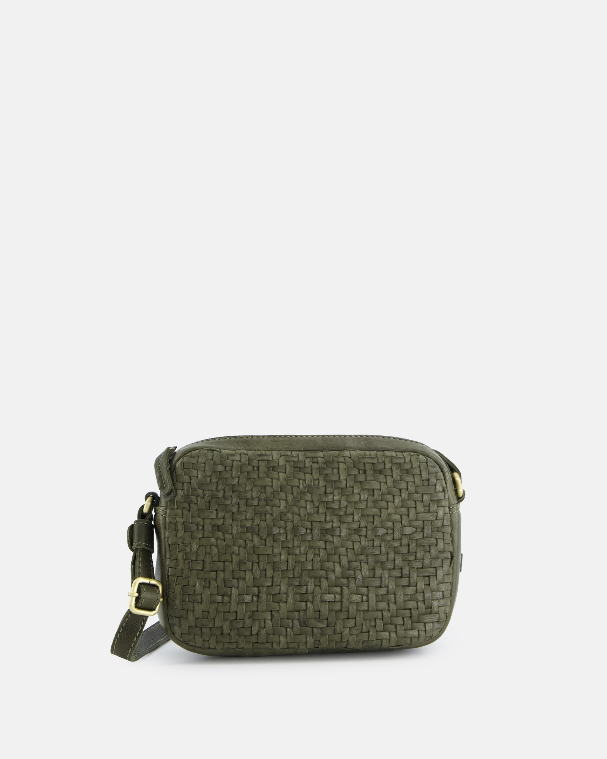 Маленька сумка-месенджер з натуральної шкіри приглушеного оливкового відтінку. Спереду прикрашена тасьмою зі смужок шкіри, що створює характерну тривимірну структуру. Компактна, прямокутна форма зі злегка закругленими краями. Зверху модель закривається на блискавку. Регульований ремінь дозволяє носити сумку на плечі або через плече. Фурнітура кольору старого золота підкреслює класичний характер. Шкіра з матовим покриттям і злегка м'якою формою. Компактний розмір для щоденного використання.