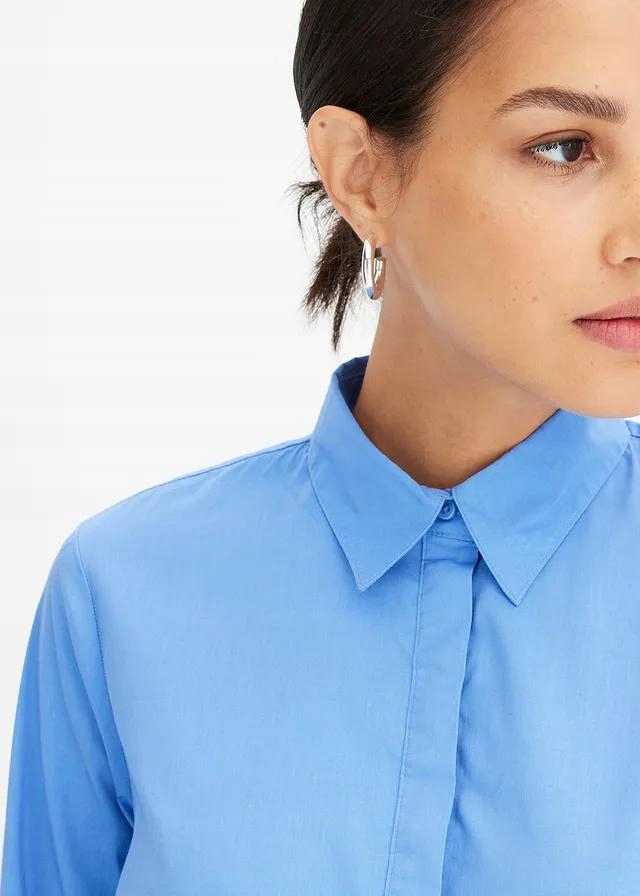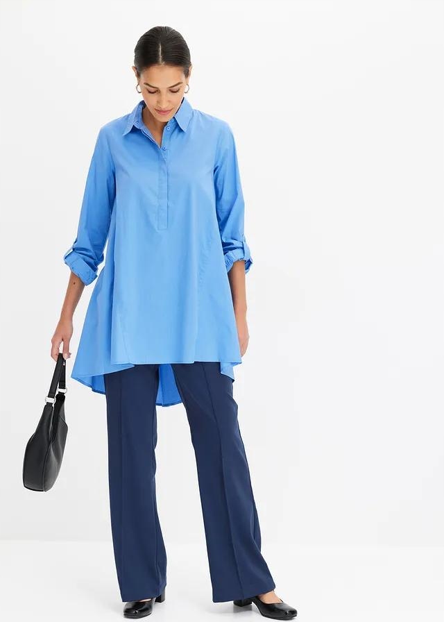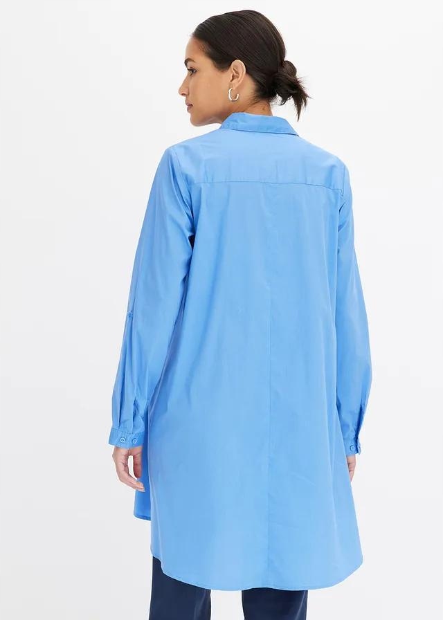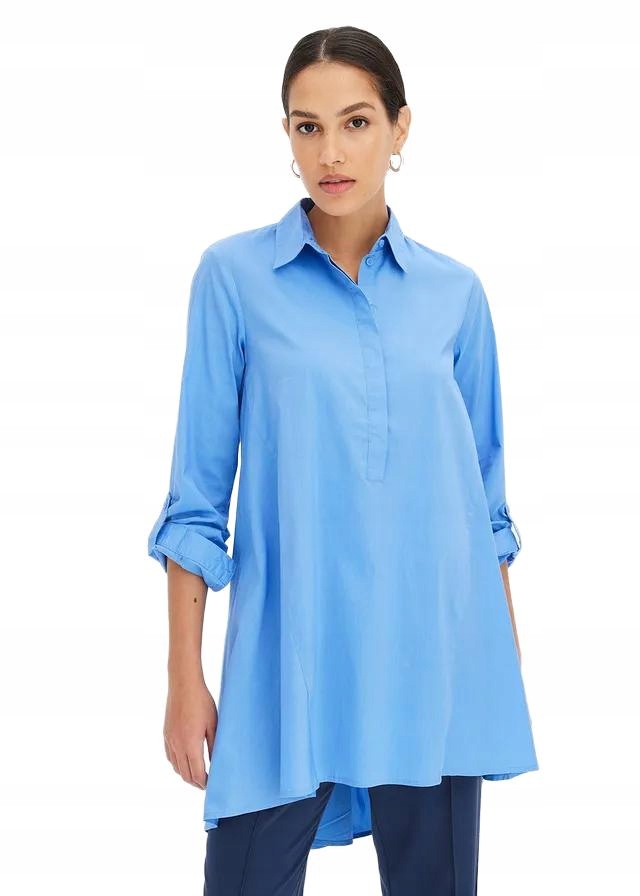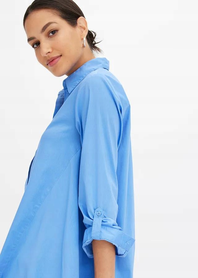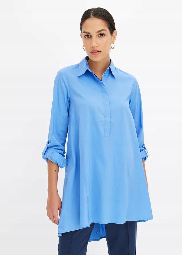 модна блакита блакитної сорочки з розширеною задньою лінією - чудовий вибір для повсякденних та елегантних стилізацій. Світлий, приємний матеріал забезпечує комфорт носіння, а довша спина тонко маскує стегна, підкреслюючи фігуру. Ідеально підходить для джинсів, гетри та спідниці.