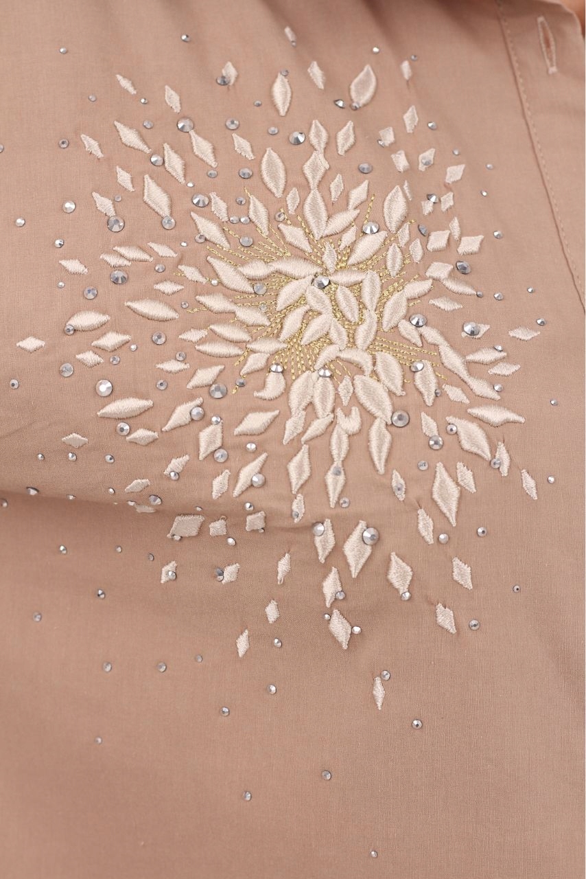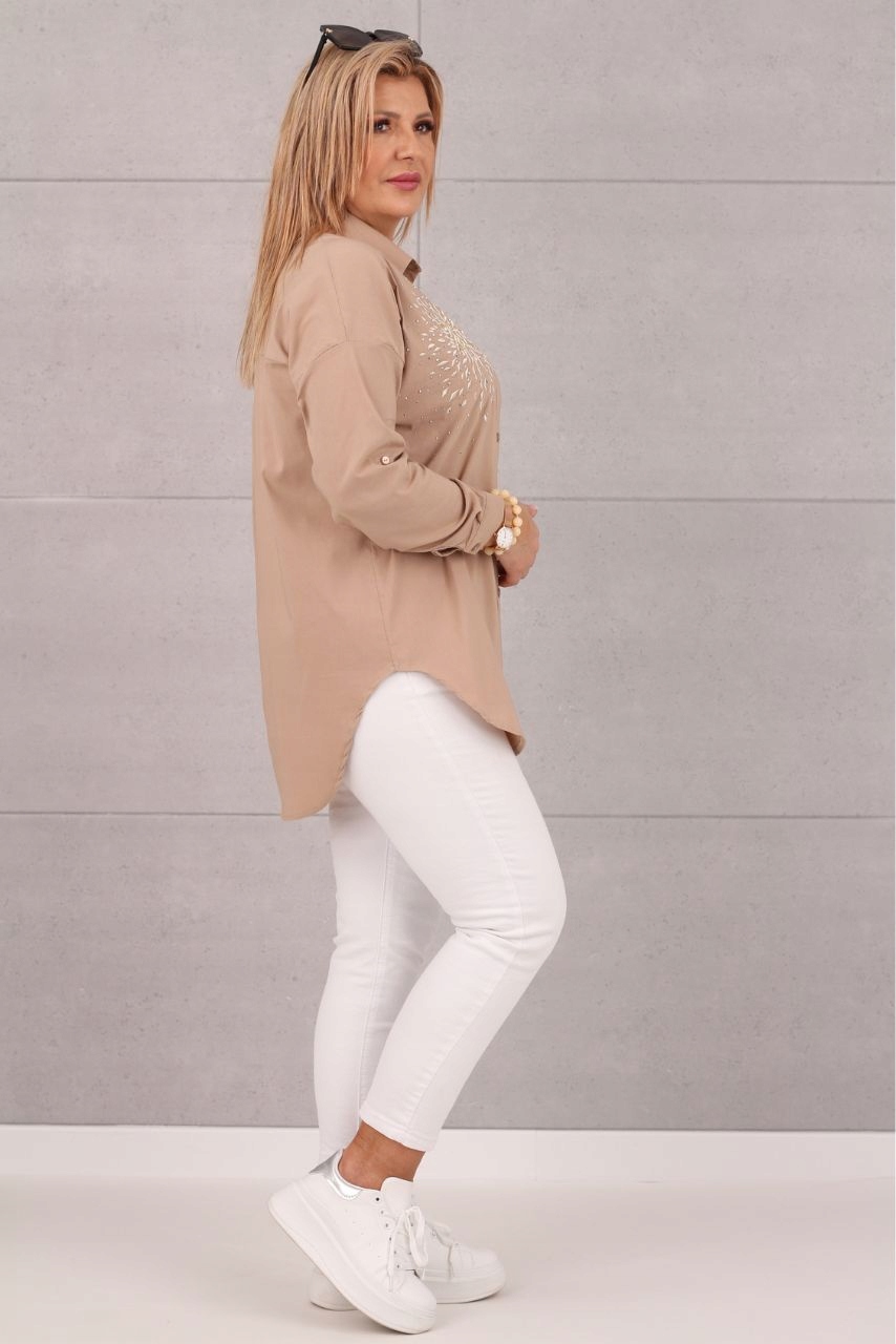 Ця сорочка поєднує в собі класику та тонкі акценти. Вишита вставка над бюстом надає йому неповторного жіночого шарму та чарівності. Крій oversize гарантує комфорт і свободу рухів, підкреслюючи достоїнства кожної фігури. Він чудово підійде як до повсякденного стилю з повсякденними брюками та кросівками, так і до більш елегантних поєднань із елегантними брюками та туфлями на підборах.