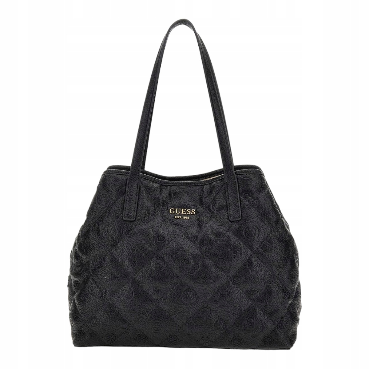- Логотип: опуклий металевий напис «GUESS EST 1981» спереду, опуклий металевий напис «GUESS» на сумці, написи «GUESS» на всередині на підкладці, на поверхні сумки логотип 4G і пеони