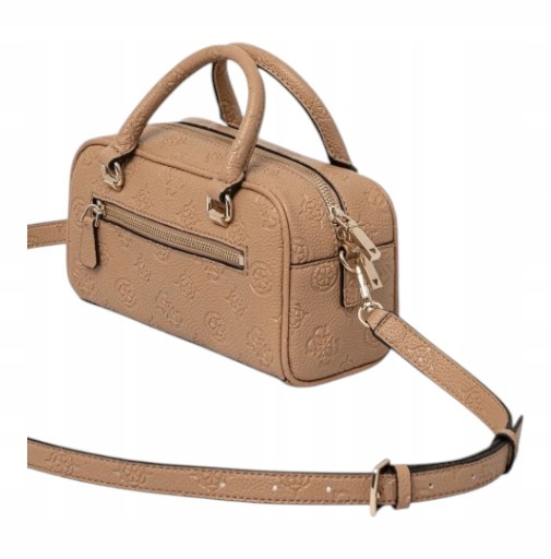 - Логотип: 4G і логотип півонія на поверхні сумки, опуклий спереду трикутник із написом "GUESS USA" і "?" знак, всередині підкладки написи «GUESS» та металева табличка з написом «GUESS EST. 1981», на фурнітурі вигравірувано напис «GUESS»