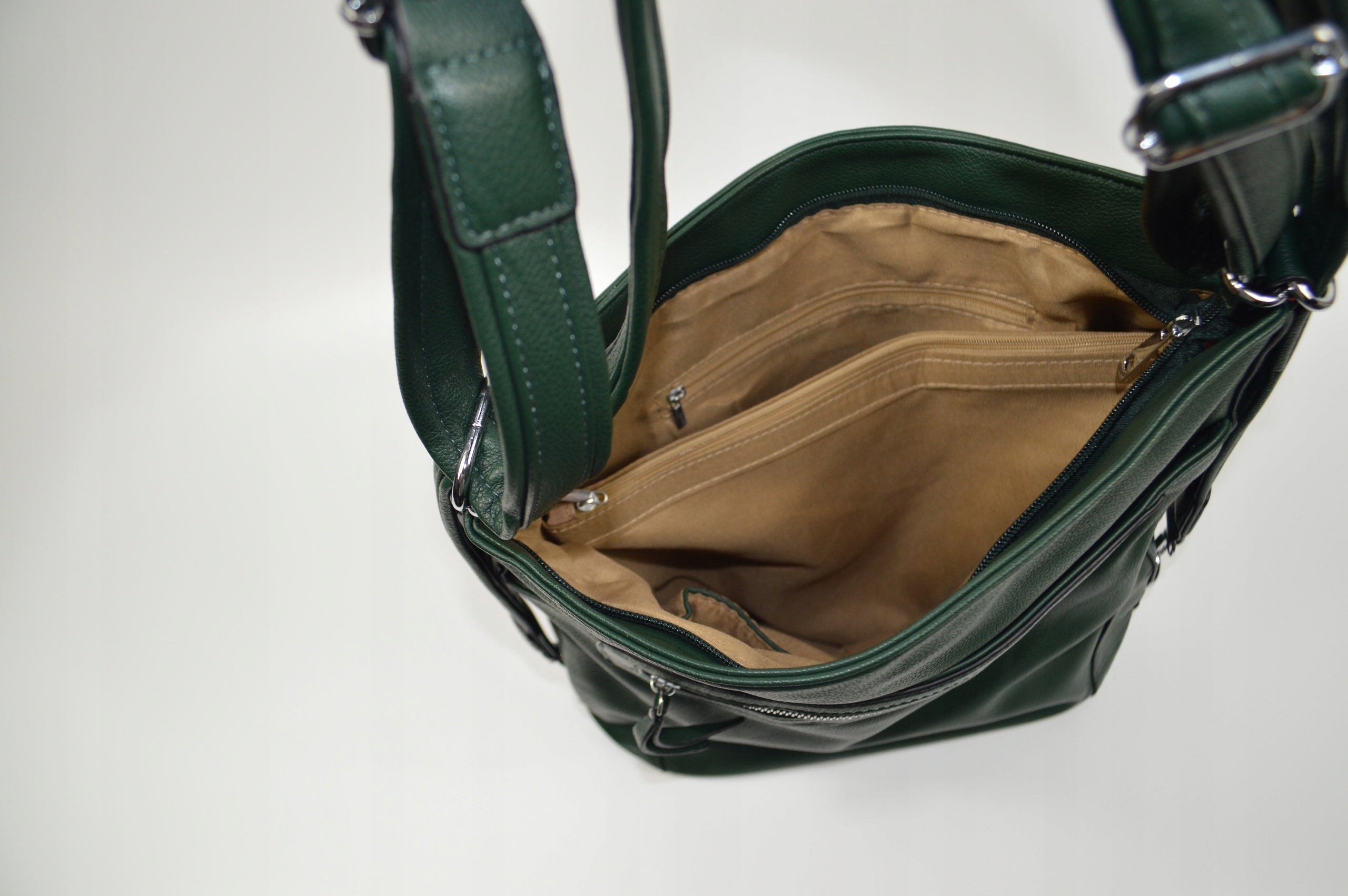 - -одне відділення на блискавці з кишенею по всій сумці, маленька кишеня на блискавці та дві відкриті одиниці. кишені