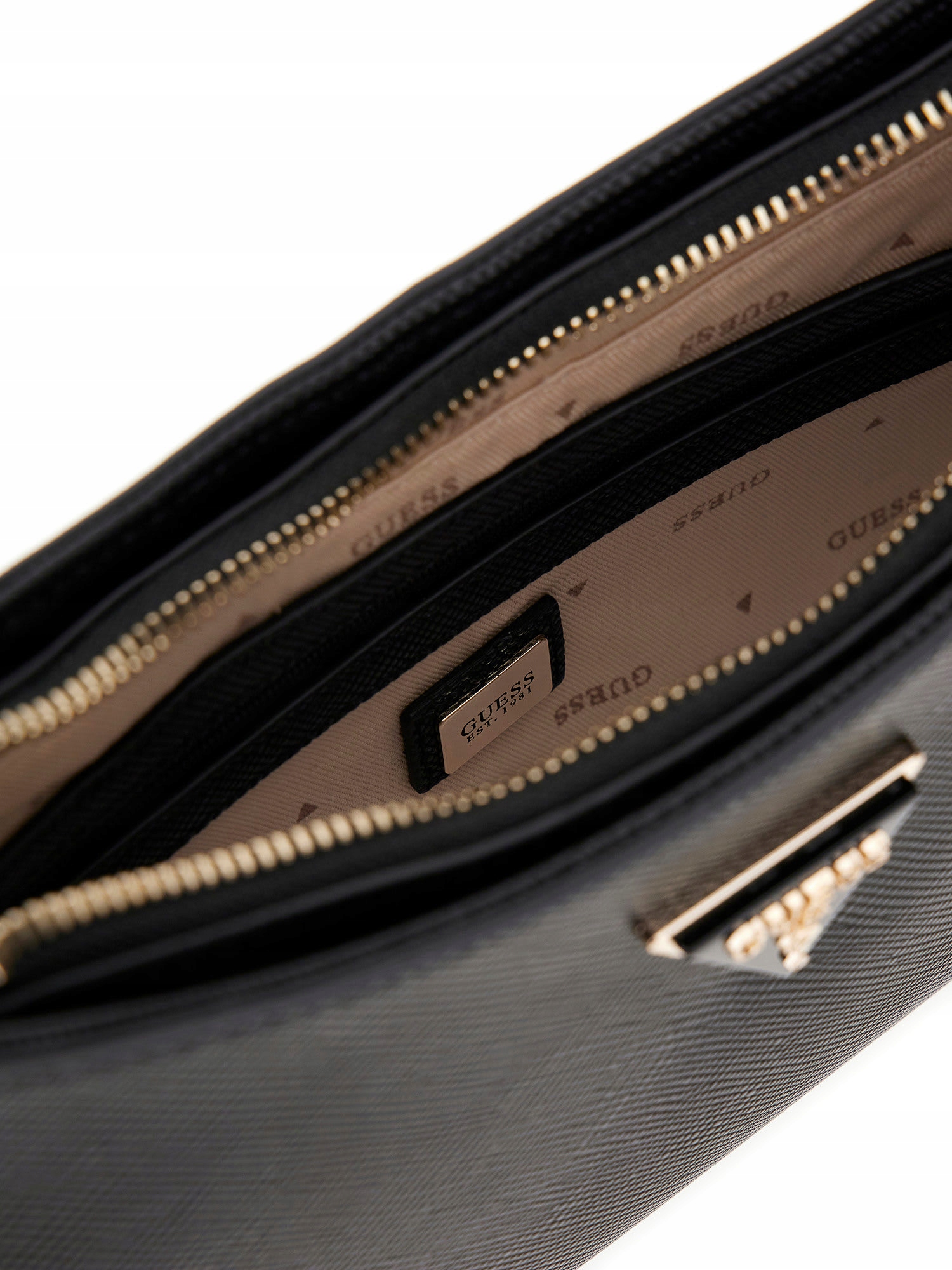 - Логотип: спереду опуклий трикутник із напис "GUESS USA" з "?" знак, всередині на шкіряній нашивці металевий значок з написом «GUESS EST.1981», на блискавці вигравіруваний напис «GUESS», на знімному брелоку опуклий металевий напис «GUESS», на іншому «1981», на підкладці написи «GUESS»