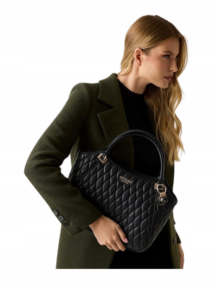 - Логотип: на передній частині сумки опуклий металевий напис «GUESS EST» 1981», спереду декоративний брелок з літерами, що утворюють слово «GUESS», всередині на підкладці написи «GUESS» та металева табличка з написом «GUESS EST.1981» вигравірувана на фурнітурі напис «GUESS» вигравіруваний