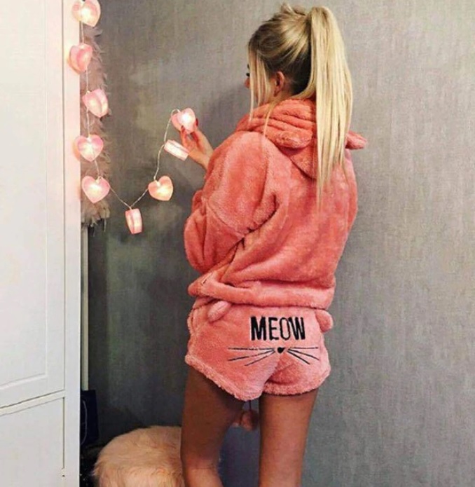 ✅ ЗОВНІШНИЙ ВИГЛЯД - піжама рожевого кольору з милими котячими вушками на капюшоні та шортах, на задній частині шортів є мордочка кота та напис МЯУ.