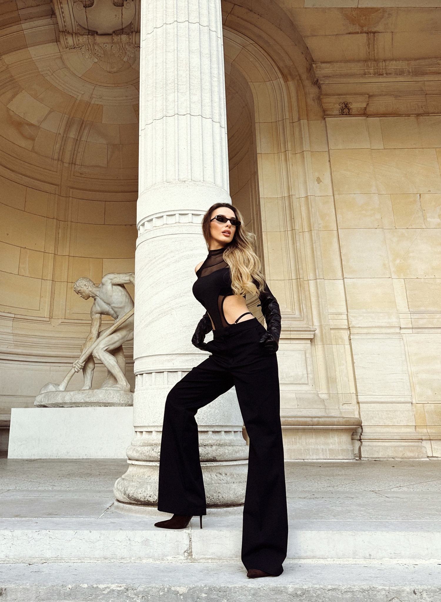 Limited Black ILUSION body — це дизайн із сучасною лінією, що підкреслює фігуру. Прозорі панелі створюють ніжний контур на шкірі, а більш глибокі вирізи з боків красиво звужують талію. Відкриті плечі та сильні вирізи надають моделі характеру, типового для колекцій класу люкс. Рукава мають отвори для пальців, які елегантно подовжують руку та зберігають ідеальне положення. У верхній частині є інтегрований чокер зрегулюванням, який підкреслює лінію шиї та додає виразний акцент у цілому.