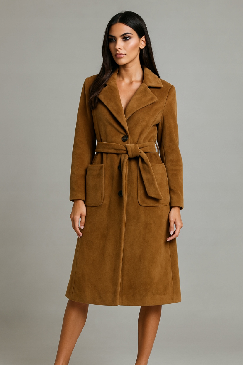 Пальто максі темного верблюжого відтінку – вибір для жінок, які цінують елегантність і вишуканий стиль. Пояс гарно формує фігуру, а великі накладні кишені надають практичності. Подовжений максі-крій робить пальто надзвичайно шикарним і забезпечує тепловий комфорт навіть у холодні дні. Ідеально підходить для роботи, елегантних зустрічей або повсякденних прогулянок.
