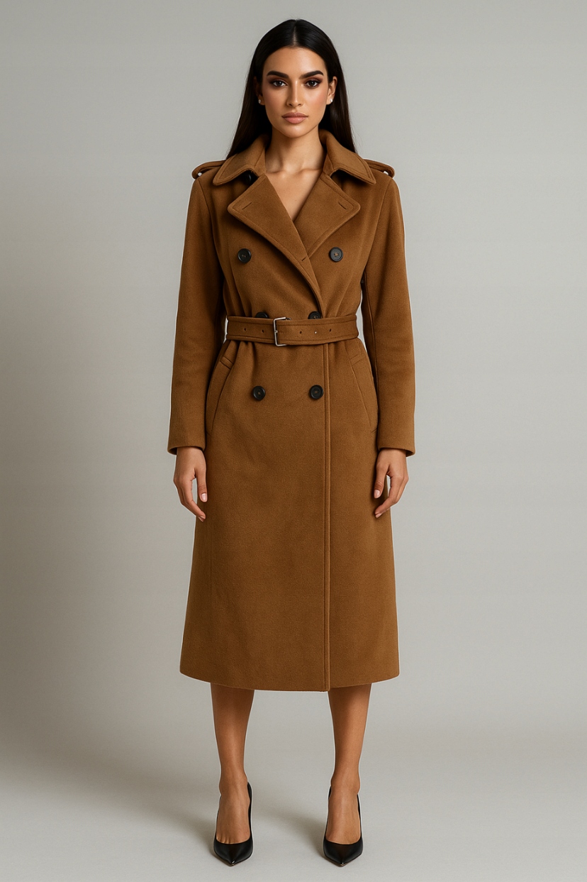 Жіноче двобортне максі з поясом – Camel