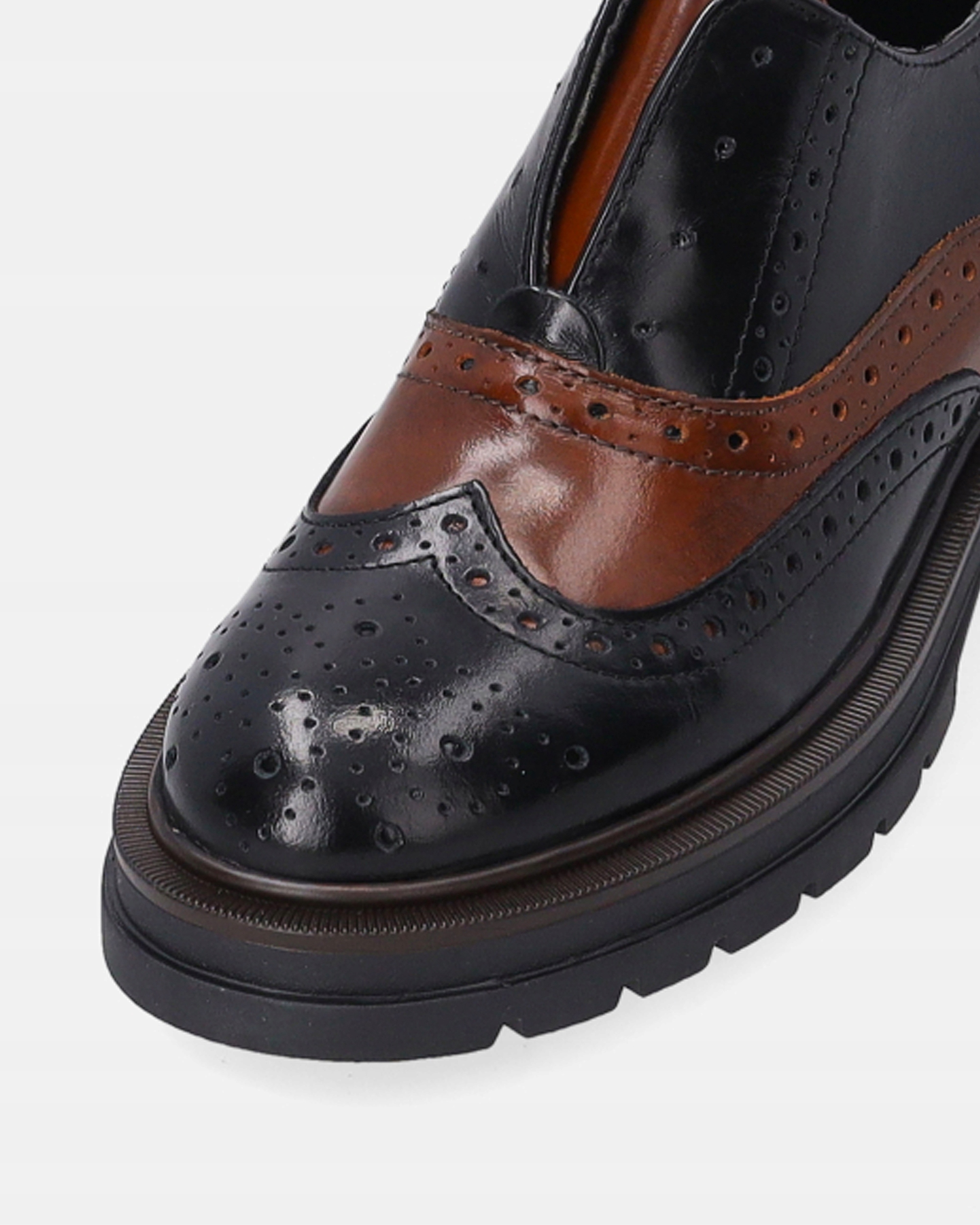 Жіноче взуття з натуральної шкіри в поєднанні чорного і коричневого кольорів. Класичний крій підкреслюють характерні ажурні прикраси та декоративна строчка. Модель сліпон забезпечує зручність одягання. Масивна підошва з виразним протектором надає взуття сучасного акценту.