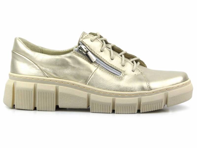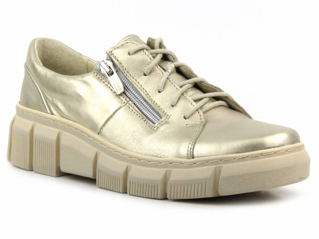 Жіноче взуття відомого польського бренду Helios Komfort виготовлено з високоякісної натуральної шкіри золотого кольору. . Шкіряна, профільована устілка забезпечить комфорт вашій нозі. Блискавка дозволить вам швидко та зручно взутися. Однак завдяки регульованим шнуркам ви можете легко відрегулювати верх. Підошва з високоякісного матеріалу легка та зручна, а також забезпечує хорошу амортизацію та теплоізоляцію.