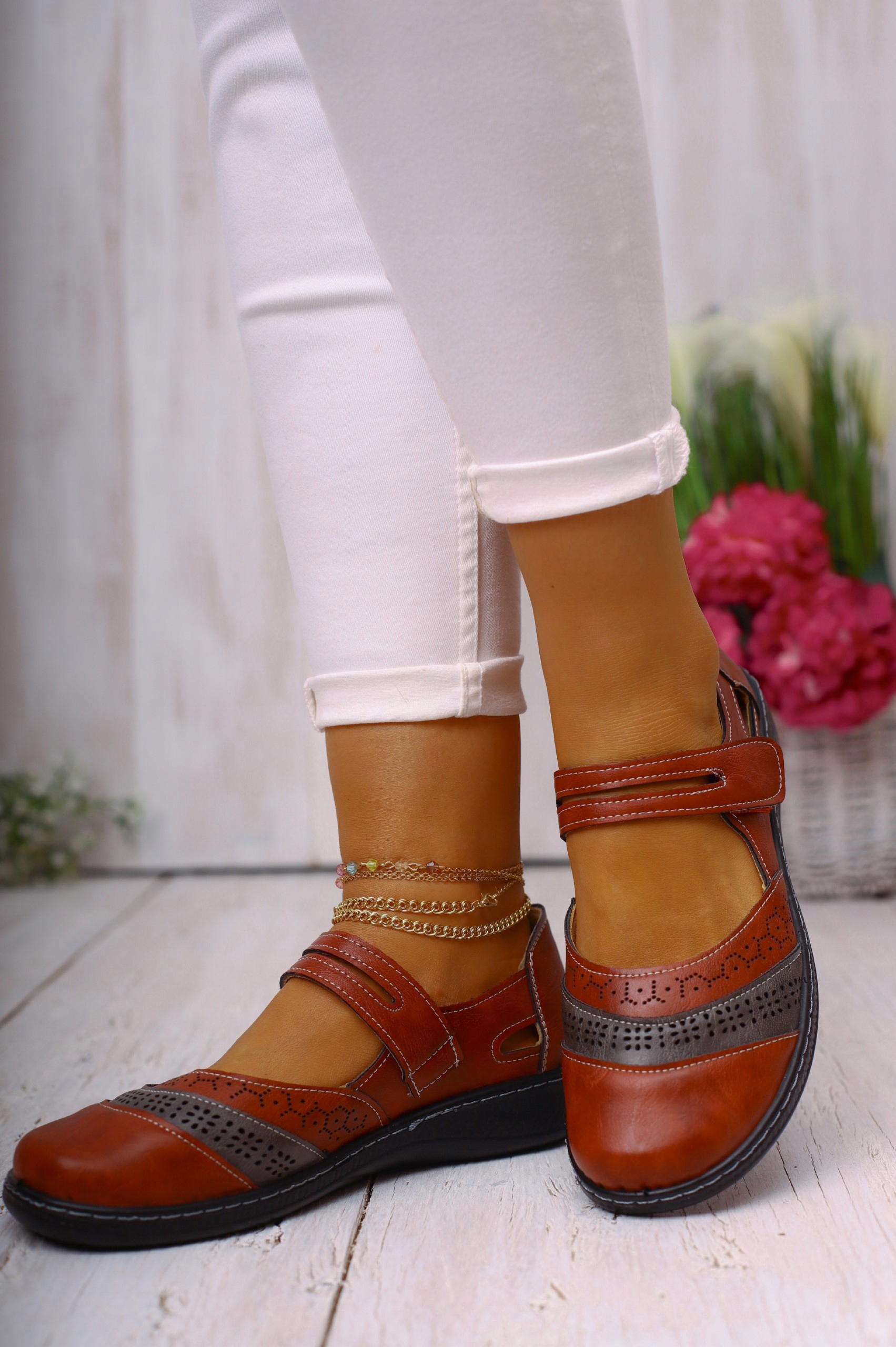 Відкриті роботи, жіноче взуття з червоними вирізами на низькому клині. Ідеально підходить для теплих днів. Вони працюватимуть як щоденне або робоче взуття. Листкро -застібка полегшує надягання. Виготовлений з хорошої якості матеріалів. М'яка шкіряна устілка забезпечує комфорт. Простий розріз легко адаптується до багатьох стилів.