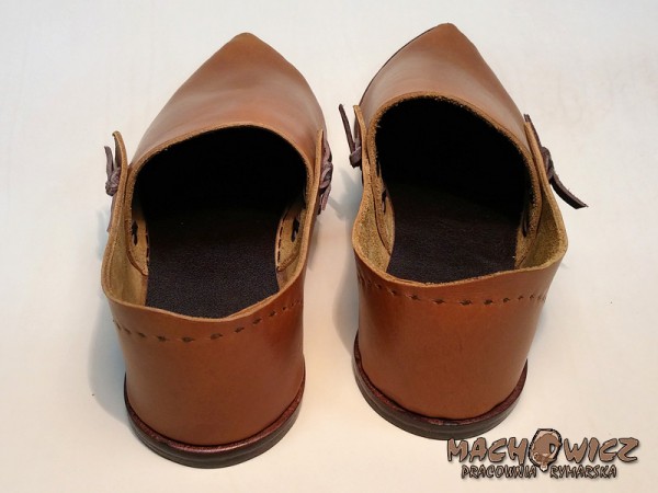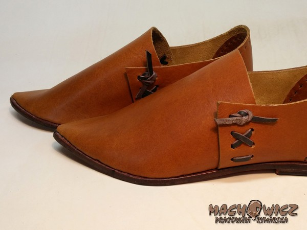 Жіноче взуття, виготовлене за мотивами середньовічної іконографії. Виготовлені з натуральної шкіри, підкладка з рослинного жиру, товщиною приблизно 2,5 мм. Підошва з товстої задньої шкіри, приблизно 5 мм. Взуття зшито вручну вощеним шпагатом і глухим швом, щоб уникнути стирання шва. Взуття укріплене каблуком з товстої обушної шкіри, що кріпиться до підошви дерев'яними шпильками, за традиційною технологією виготовлення взуття. Підошва та каблук взуття просочені бджолиним воском.