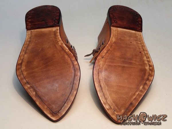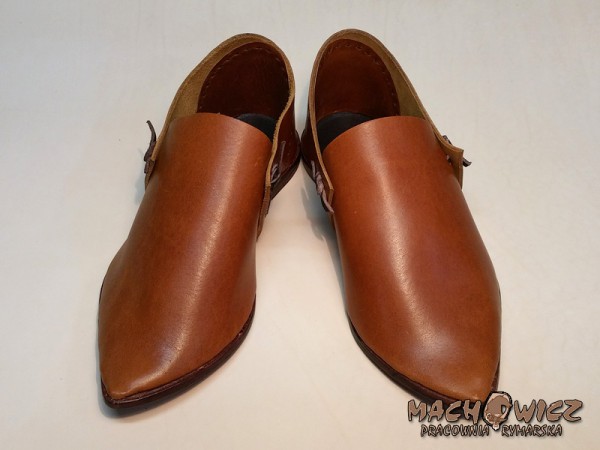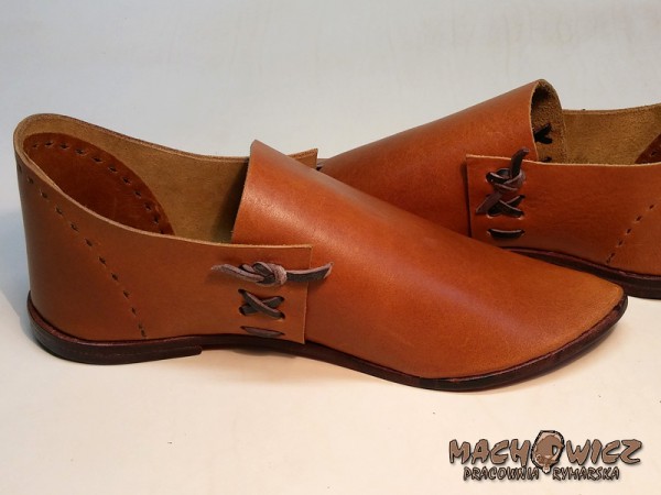 Жіноче взуття, виготовлене за мотивами середньовічної іконографії. Зроблена з виступаючої шкіри, підкладка з рослинного жиру, товщиною приблизно 2,5 мм. Підошва з товстої задньої шкіри, бл. Взуття зшито вручну вощеним шпагатом і глухим швом, щоб уникнути стирання шва. Взуття посилено каблуком з товстої обушної шкіри, прикріпленої до підошви дерев'яними шпильками, за традиційною технологією виготовлення взуття. Підошва та каблук взуття просочені бджолиним воском.