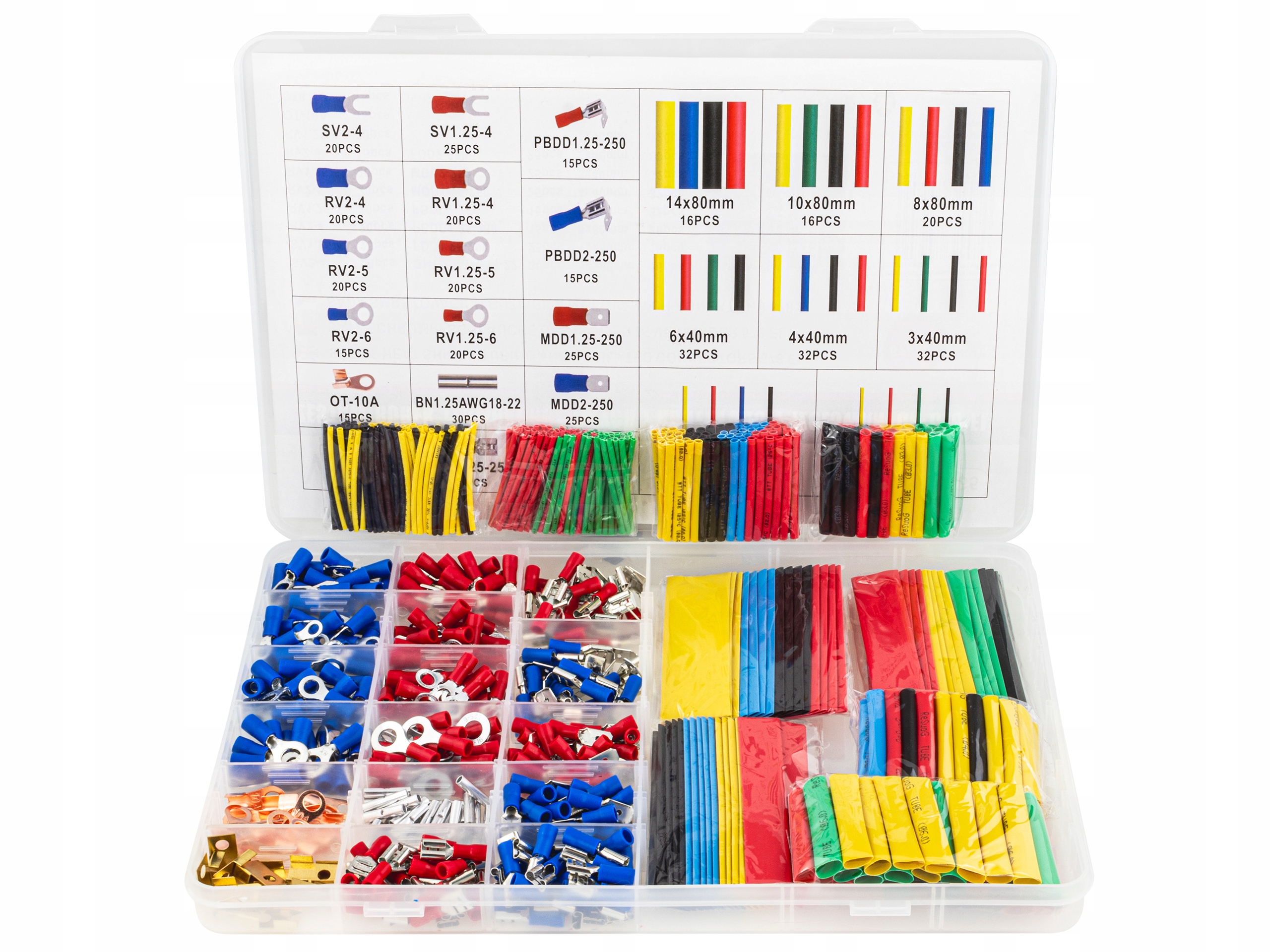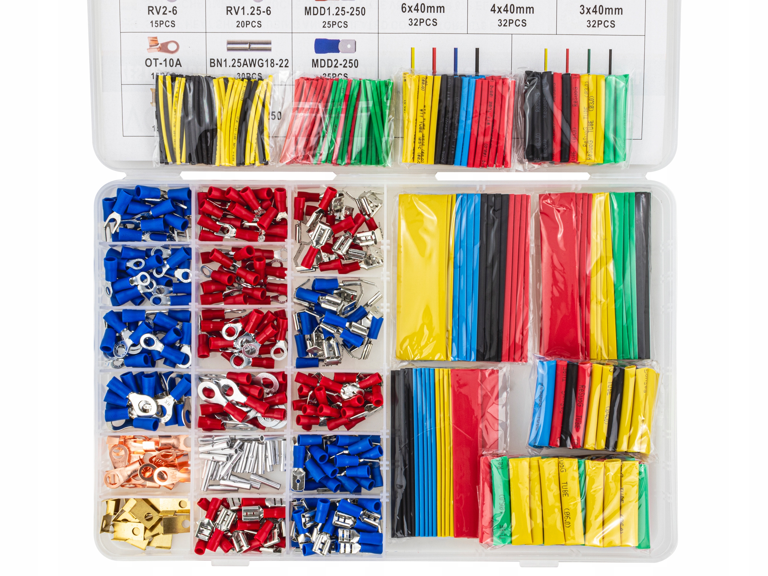 Набір з'єднувачів та трубки з термозміною. Набір включає 687 частин різних елементів. Набір включає в себе окуляри, вилки, ковзання, натискання та роз'єми дроту в ізольованих та неповноцінних версіях. Крім того, набір включає 328 шматочків трубочок для зменшення тепла розміром від 1 до 14 мм2. Ціле упаковане в пластиковий організатор.