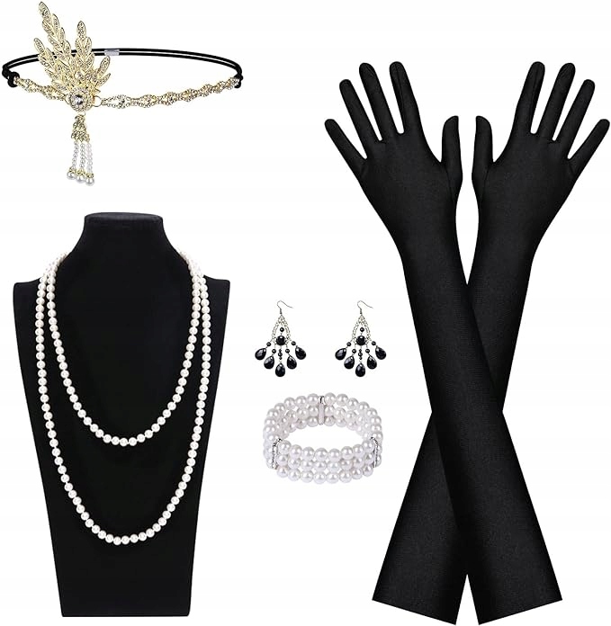 ✅ У НАБОРІ З 6 ЕЛЕМЕНТІВ: Наш набір містить аж 6 елементів, включаючи перлинні намиста, браслети, сережки і віяло, що дає Вам повний спектр можливостей для вираження свого унікального ретро-стилю.