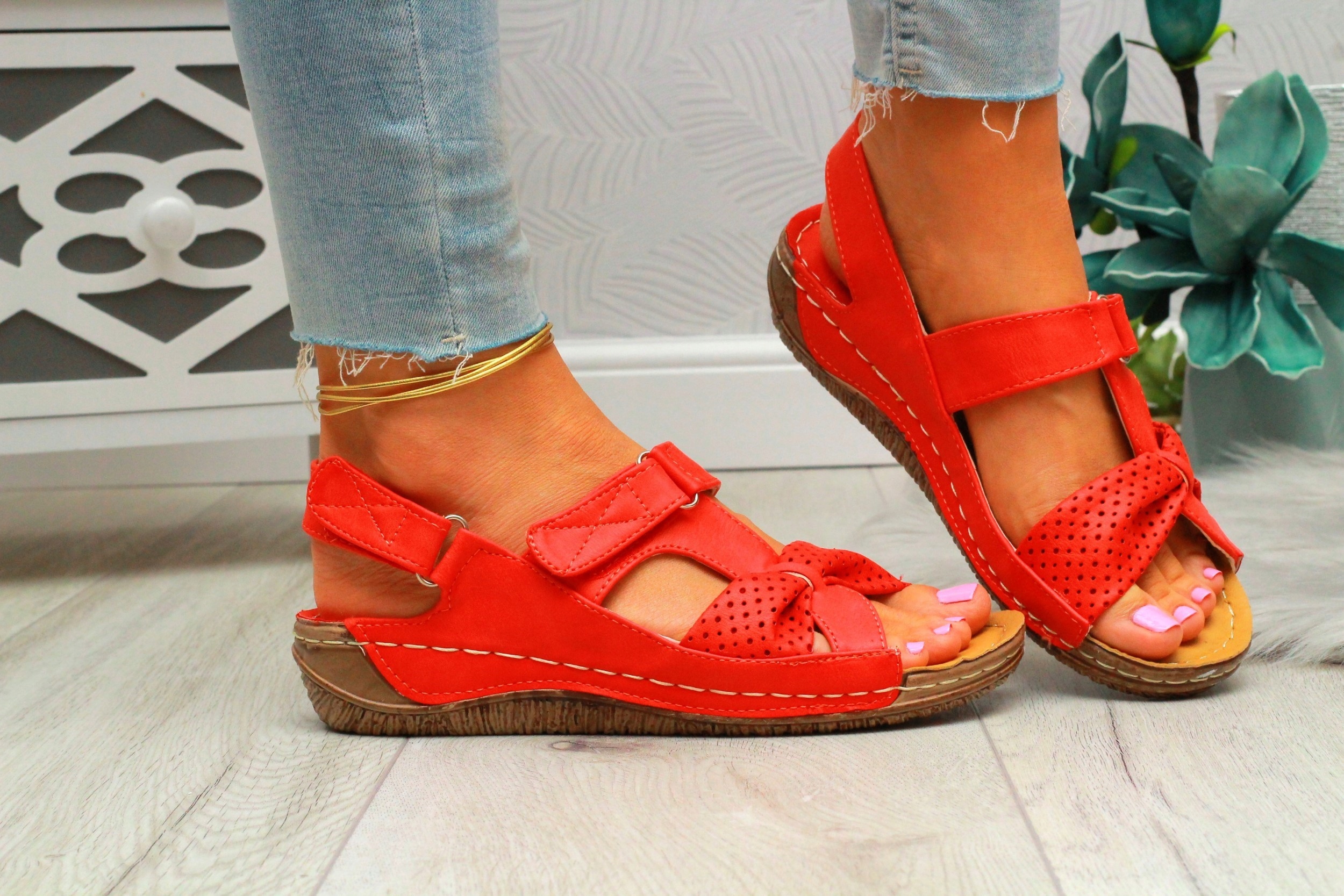 Жіночі босоніжки на товстій підошві червоного кольору. Зручна, профільована вставка робить їх ідеальними для повсякденного використання. Простий чорний зріз адаптувався до багатьох стилів. Листкро -застібка полегшує вставку. Пришита підошва призводить до більш тривалої міцності взуття. ·