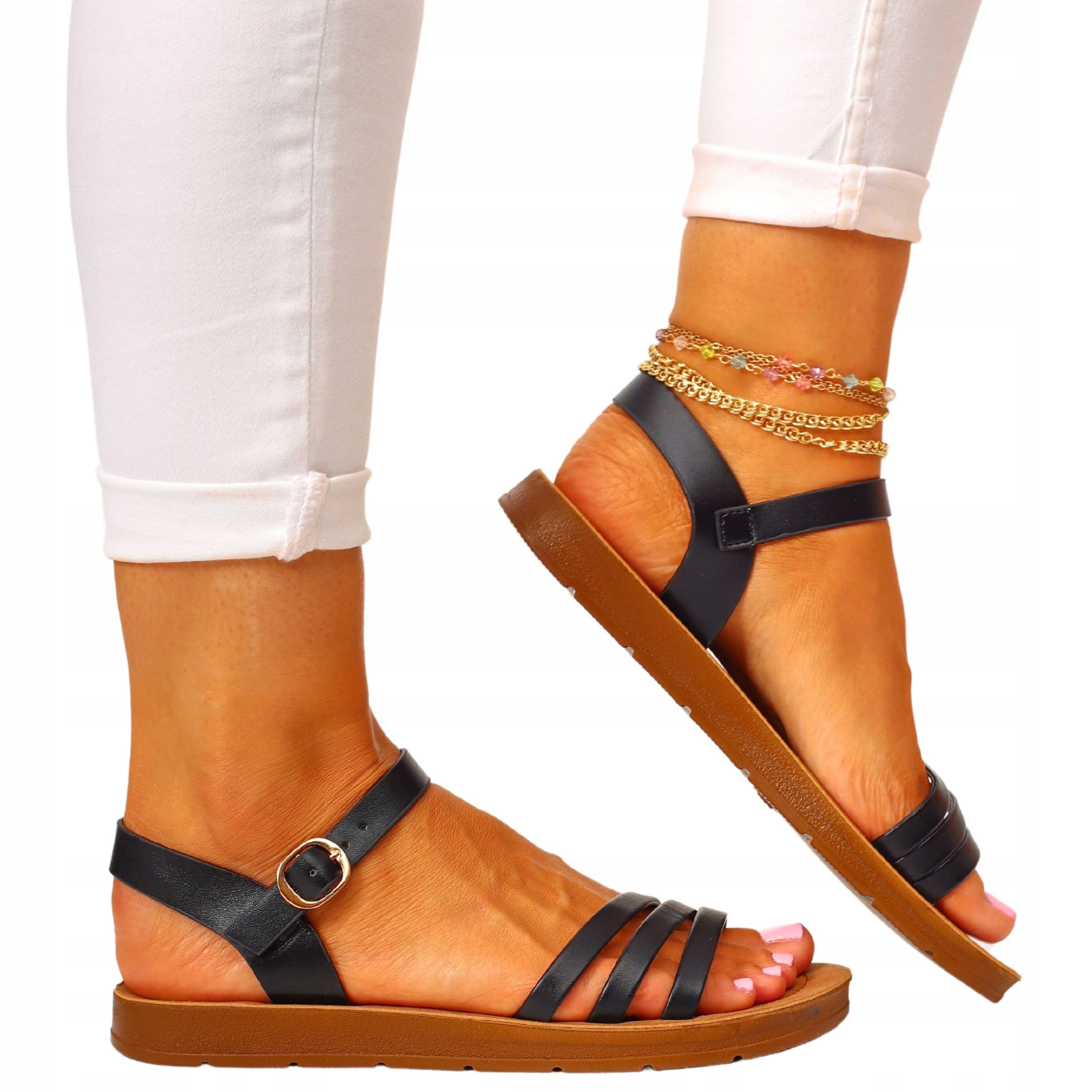 Жіночі чорні босоніжки з рівним низом. Вони ідеально підходять як повсякденне взуття в спекотні літні дні. Зручна профільована устілка робить їх ідеальними для щоденного використання. Простий дизайн також підійде до елегантних стилів і додасть шарму будь-якому стилю. Еластичний ремінець на п'яті полегшує взування та підгонку взуття до стопи.